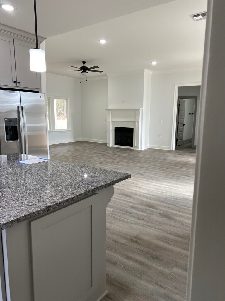 New home, located in a desirable location, close to shopping and schools. Large Living room with fireplace. Bright and airy main-level master suite is a place where one can soak in a hot tub or linger in a dressing room. Separate vanity areas with separate sinks and mirrors, soaking tub, and a shower. A well designed and functioning kitchen offers a seamlessly Built-In Refrigerator. An Open Layout For Cooking and Entertaining. Hidden Trash and Recycling. Cabinets That Amaze. Flooring That Holds Up. High-Performance Appliances. Impressive Countertops. The covered back porch with ceiling fan offers in the back yard offers privacy and a space to entertain.