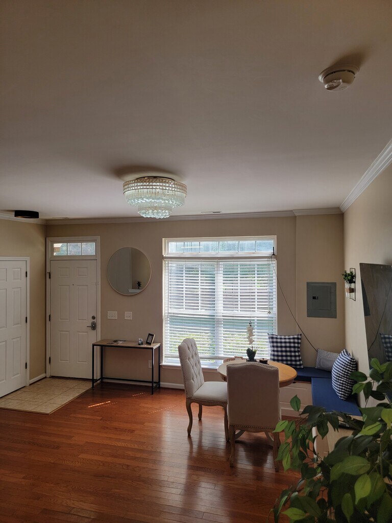 Beautiful 3-level townhome located in the highly desirable Bedford community in North Raleigh! This prime location offers convenient access to everything you need--shopping, dining, medical facilities, and quick access to I-540. The first floor features an open-concept layout with a spacious kitchen and living area, complete with stainless steel appliances, granite countertops, and tile and hardwood flooring. The second floor includes two bedrooms that share a full bathroom, along with a convenient laundry room. The third level is dedicated to the private primary suite, featuring a large bedroom and an additional sitting area spacious enough for a sectional sofa--perfect for relaxing or creating a private retreat. The primary bath offers a large soaking tub and a separate shower. This unit is located on the back side of the 2220 building, providing added privacy. Please note: the fireplace is not connected to gas. Enjoy community amenities including a pool, with HOA covering trash collection and lawn maintenance. Conveniently located near grocery stores, shopping centers, and nature parks--this home truly has it all! For more information, call or visit to schedule a self-tour. Small to medium dogs are negotiable.