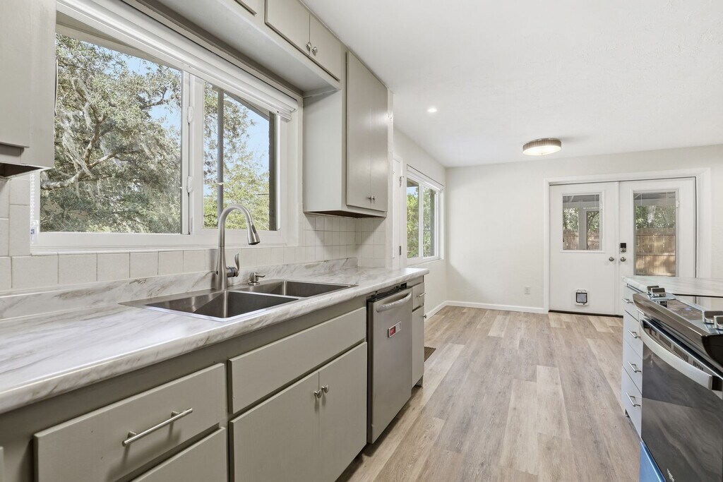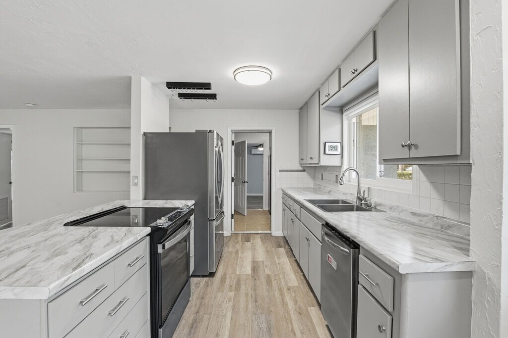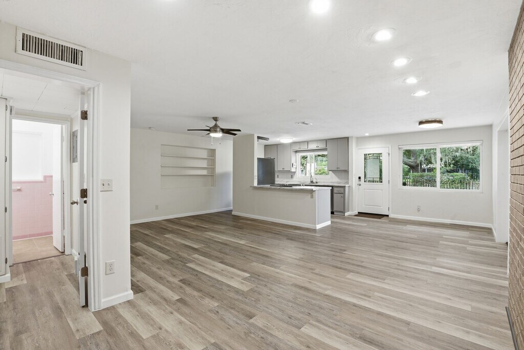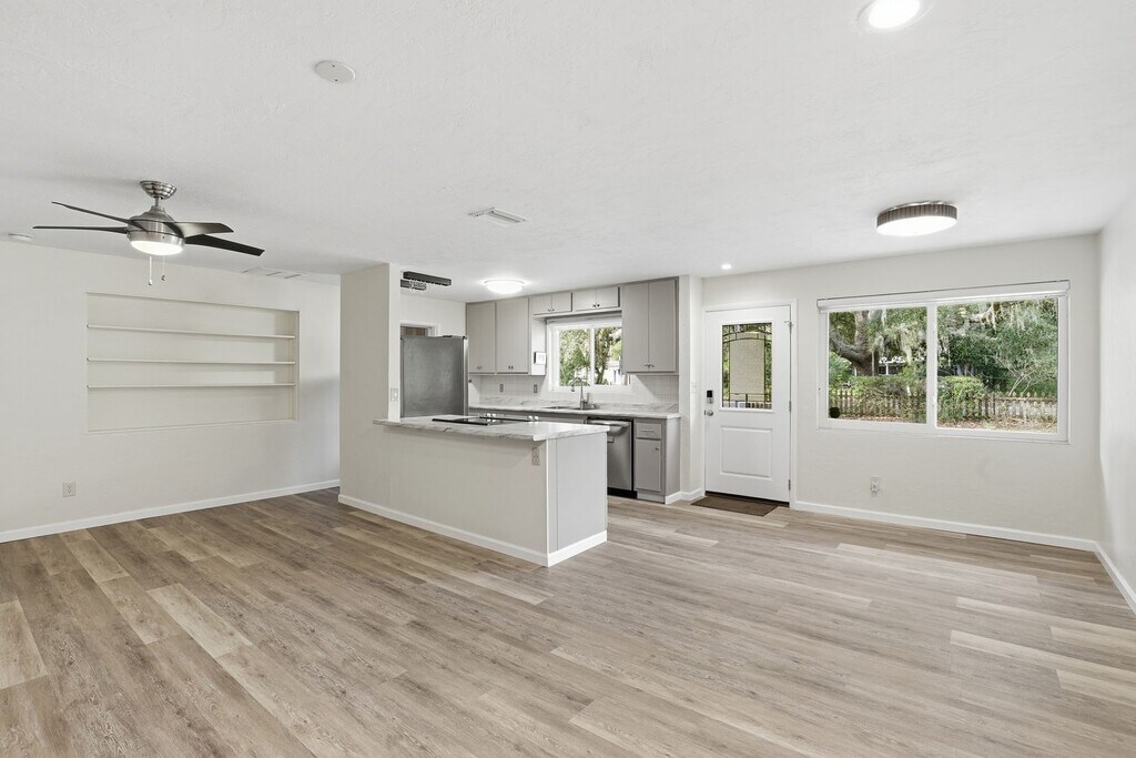 If you are searching for a spacious four-bedroom, three-bathroom home with ample storage and outdoor living space, this property is a true gem. Recent upgrades include wood look, vinyl plank flooring throughout, fresh paint both inside and out, a new energy-efficient HVAC system, and stainless steel appliances. Upon entering through the front door, you will find a welcoming common area that encompasses a large family room, kitchen, and an eat-in dining area—ideal for gatherings around the table. The home's thoughtful layout features a three-way split design, with the master bedroom situated at the rear, boasting an oversized walk-in closet complete with shelving for your belongings, as well as direct access to a gazebo and patio. Toward the back, there is an additional area comprising two bedrooms and a full bathroom. Finally, off the kitchen at the front of the home, you will discover an in-law suite equipped with its own kitchen, full bathroom, closet, and laundry room. A washer and dryer are included, though they are not warranted. The outdoor living space is extensive, set on a quarter-acre lot that includes a gazebo patio and two screened porches. Additionally, the property features a large storage room at the front, perfect for crafts or general storage, and an air-conditioned portable studio, which can serve as an office or art studio. This home is conveniently located near schools, shopping, downtown Gainesville, and the University of Florida. Metcalfe Elementary is also within walking distance. Small pets are allowed with a non-refundable deposit of $250 per animal. To schedule a tour please call Union Properties at or visit us online at