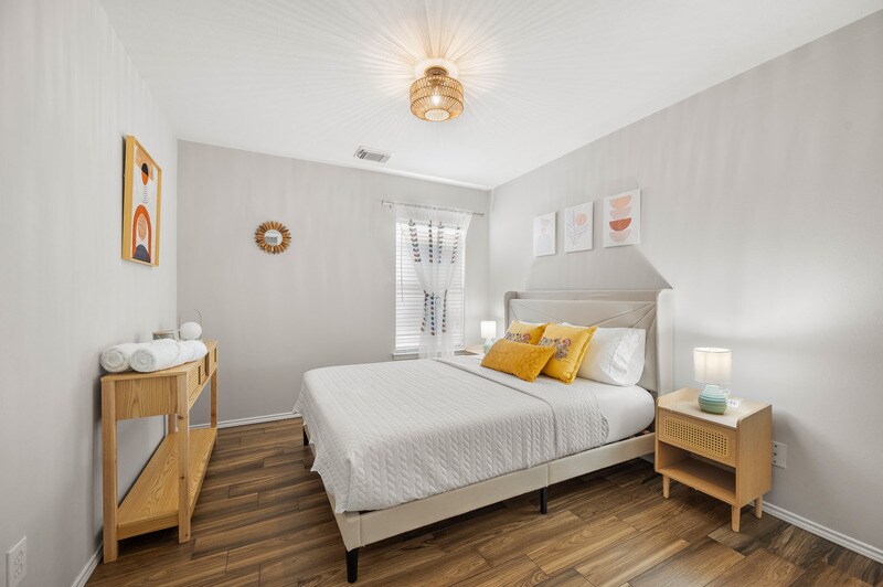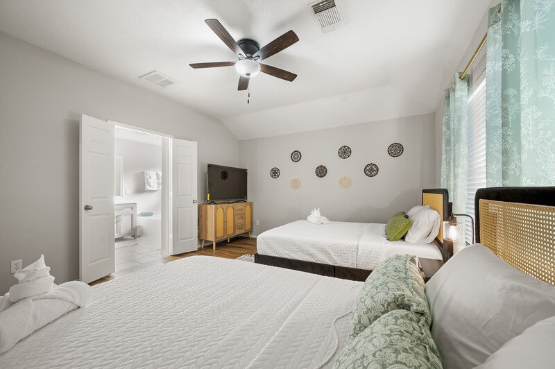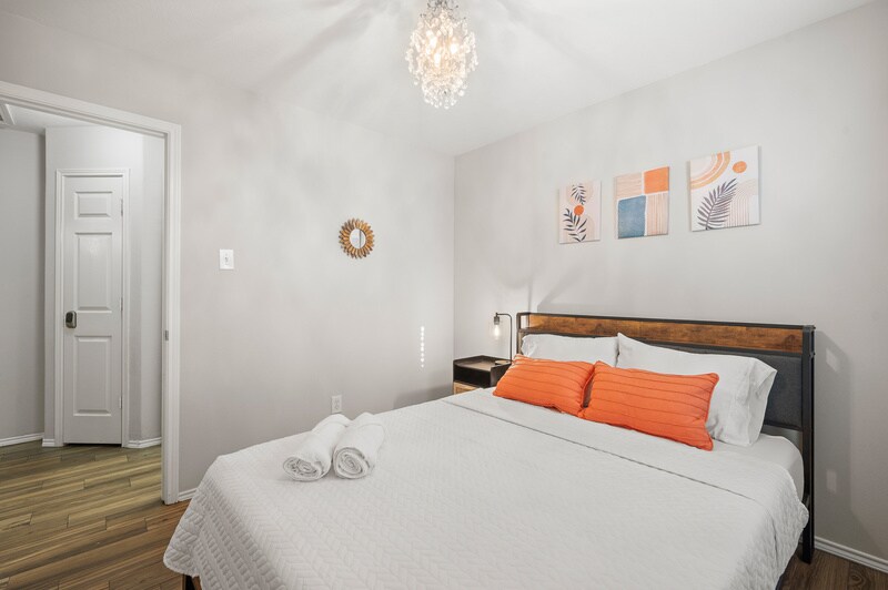 Welcome to your chic home away from home! Our beautifully designed space is perfect for families or remote workers, blending modern comfort with a touch of style. Relax in the airy living room, enjoy meals at the spacious dining table, and retreat to cozy bedrooms. The fully equipped kitchen makes cooking easy. We provide kid-friendly essentials like bassinet, highchair and toys to ensure a stress-free stay. Located in a prime spot, it's the perfect place for unforgettable family adventures! Our charming one-story house features a bright open floor plan with tile floor throughout. It has 3 bedrooms, 2 bath, and 1 flex room. The house was designed and fully furnished with new furniture, beautiful decoration, high-speed internet, smart TVs, Washer/Dryer, designated working area with raise desk and children play space to make your stay effortlessly enjoyable. The primary bedroom features one queen bed and one double bed, double-sink in master bath, walk-in shower, garden tub and is ensuite with a walk-in closet. The 2nd and 3rd guest room each has one queen size bed with walk-in closet. The flex room has one twin size daybed with twin trundle/pull out bed for extra sleepers. It is close to major highways Hwy 99 & I-10, hospital, shopping, eateries, and entertainment centers. - 4 minutes to Walmart Super Center, Kroger, Restaurants - 7 minutes to Grand Parkway Park & Ride, Katy Asian Town (H-mart, Boba Tea, eateries) - 12 minutes to Memorial Hermann Katy Hospital - 12 minutes to Typhoon Texas Water Park Houston - 13 minutes to Katy Mills shopping mall and Costco AIRPORTS • George Bush Intercontinental Airport | 40 miles • William P. Hobby Airport | 37 miles Local Area Amenities: • Katy Asian Town •Typhoon Texas Waterpark • Mason Creek South Hike and Bike Trail • Katy Mills Shopping Mall • Cullen Park • Bear Creek Pioneers Park • Nottingham Country Greenbelt Park • Houston Community College • The Boardwalk at Towne Lake • LaCenterra at Cinco Ranch Check out our booking website: "emmastays" "dot" "us" or find us on Airbnb.