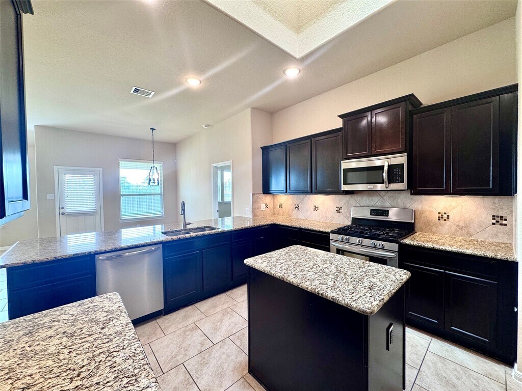 This beautifully maintained single-story home offers 3 bedrooms,2 baths,plus an additional versatile room that can serve as a 4th bedroom or office,giving you the flexibility to fit your lifestyle. The chef’s kitchen boasts granite counters,stainless steel appliances,skylight,and breakfast bar,flowing into a spacious living area with plenty of windows and abundant natural light. The luxurious primary suite features dual vanities,a soaking tub,separate shower,and a generous closet. With no carpet throughout the home,maintenance is effortless. Outside,enjoy a covered patio and private backyard with no rear neighbors—perfect for relaxing or entertaining. Conveniently located near I-45,Grand Parkway,shopping,dining,and entertainment. Schedule your showing today! MLS# 71990930