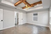 Beautifully updated 3 bedroom, 2 bathroom house offering modern finishes, an open layout, and a peaceful oversized lot. Enjoy durable stained concrete floors throughout—easy to clean and perfect for pets or kids. The spacious living area flows into a bright, upgraded kitchen featuring white shaker cabinets, granite countertops, subway tile backsplash, and stainless steel appliances. The private primary suite stands out with a tray ceiling accented by exposed wood beams, a large walk-in closet, and a stunning en-suite bathroom with a fully tiled walk-in shower. Both secondary bedrooms are generously sized with great closet space, and the second bath includes an upgraded tile tub-shower combo. Outside, the fenced backyard offers plenty of room to relax or entertain, complete with a wood deck, shade trees, and privacy fencing. The covered front porch adds even more charm and usable outdoor space.