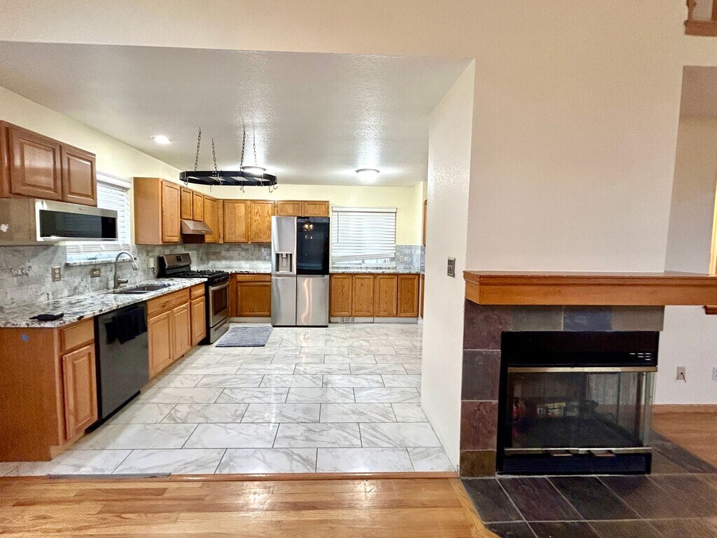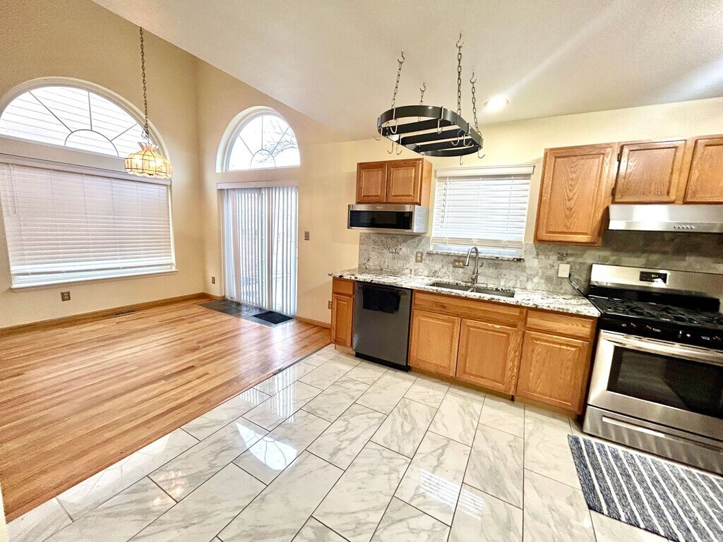 Welcome to your perfect haven in Eastridge! This charming 3-bedroom, 4-bathroom home boasts over 2,300 square feet of thoughtfully designed living space, making it the ideal retreat for modern family living. As you step inside, you are greeted by a spacious front living room adorned with beautiful hardwood floors that exude warmth and elegance. The inviting open floor plan seamlessly connects the living room to the dining area and an extra-large kitchen, perfect for entertaining friends and family. The gourmet kitchen is truly a chef’s dream, featuring stunning granite countertops and a new stove/oven, offering ample storage for all your culinary needs. The brand-new sliding glass door leads you to a huge backyard, where you can embrace the beauty of the Colorado sun on the beautiful patio—perfect for grilling, gatherings, or simply relaxing outdoors. Head upstairs to discover two (2) well-appointed bedrooms, including a luxurious primary suite complete with a full en suite bathroom for your comfort and privacy. The fully finished basement adds even more living space, featuring a cozy living room, an additional bedroom, and a private full bathroom, and washer and dryer making it an ideal retreat for guests or a perfect space for someone to call their own. Enjoy the large and fully paved backyard and stone back patio that offers lots of shade in the summer, a private place to grill or entertain and a very low maintenance backyard. Don’t miss the chance to make this delightful Eastridge home your own. With its fantastic layout, modern amenities, and lovely outdoor space, it's ready for you to create lasting memories. Schedule your viewing today and step into a lifestyle of comfort and convenience! THIS PROPERTY HAS SOLAR. Utilities: -Solar fee - $80/mo -Trash and HOA Amenities: $60/mo utility fee includes: Trash and Recycling Services, Snow Removal, Gated Community Center, Community Pool, HOA amenities, etc. -Gas and Water bills needs to be places in tenants' name LEASE REQUIREMENTS: Minimum 1 year lease. Income required is 2 times the rent. -No minimum credit score. -Dogs O.K. cats negotiable. -Pet Rent $30/pet. $300 pet deposit and all refundable. Security Deposit is 3000*Available May 16th. ****ONLY WAY TO SET A SHOWING IS TO TEXT THE PROPERTY MANAGER AND MENTION THE STREET NAME. No Calls Please****