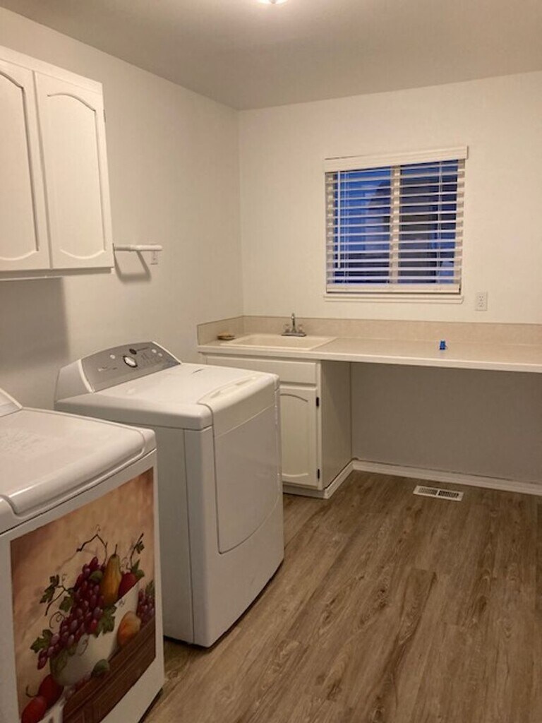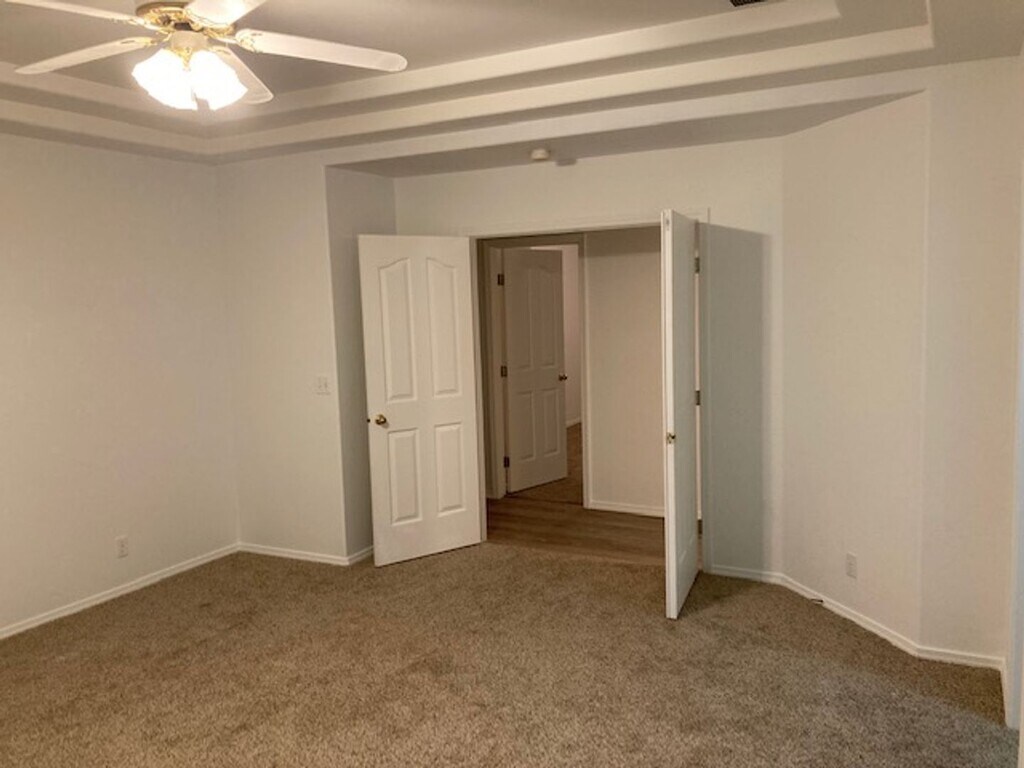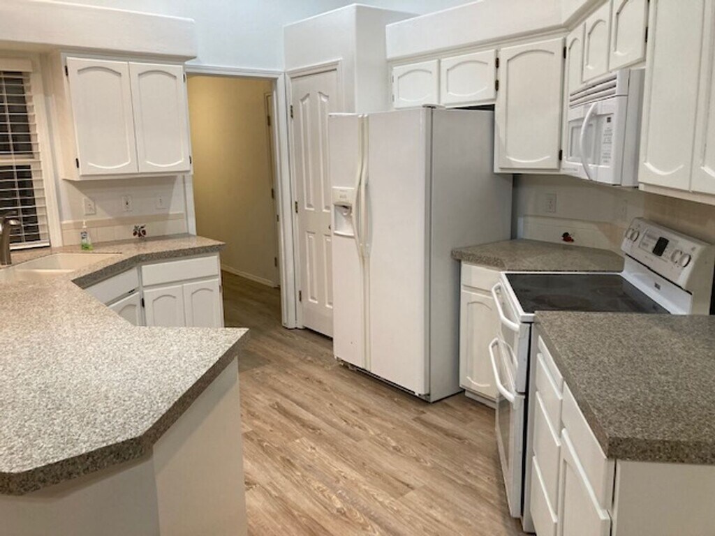 This wonderful single level three bedroom, two bath home, is available now. It boasts hardwood floors throughout the home and carpet in the bedrooms. Vaulted ceilings! Open floor plan, 3 car garage. This home is centrally located close to shopping, schools, parks, and more. Great subdivision. This home has three bedrooms and also an additional room that could be used as an office or playroom. The large primary bedroom has its own bath suite and large walk in closets. The other two bedrooms are large with large closets as well. Vaulted ceilings for the large living room with a nice fireplace. Large laundry room with plenty of storage. The home has three large garages with lots of storage area. Large fenced rear yard for your approved animals. Large covered patio for entertaining or enjoying outside meals. Home has automatic sprinklers in front and rear yards. $35.00 application fee per adult.