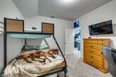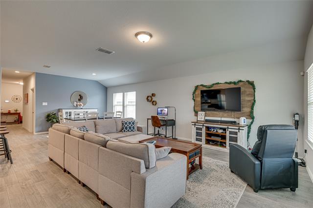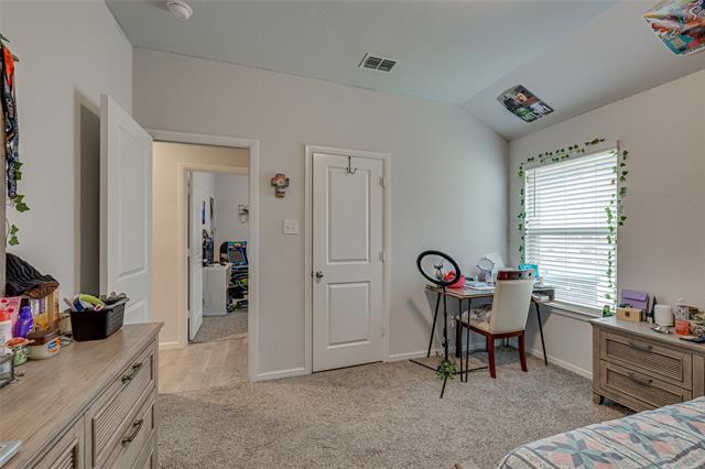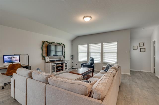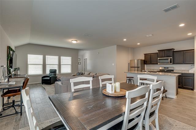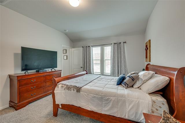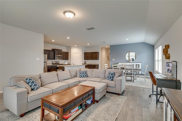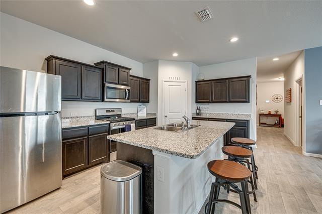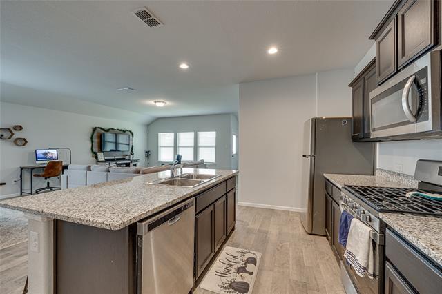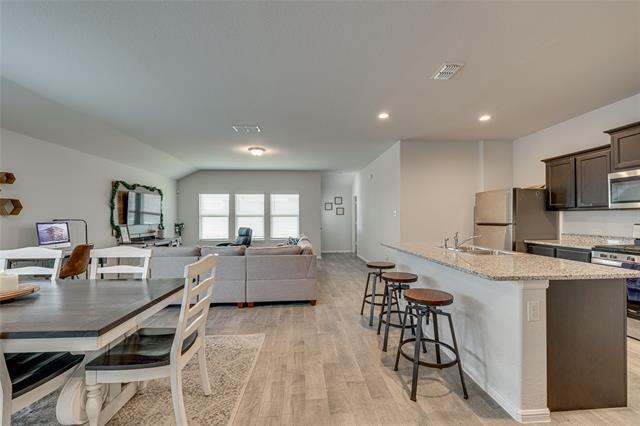 Gorgeous D.R. Horton single-story home with 5 bedrooms and 2 full baths in the open concept floor plan at Highlands at Chapel Creek. This Jackson floor plan features a Designer package with a tiled entry and tiled wet areas. The 2,133 sq ft home boasts an open concept living, dining, and kitchen with a seating and serving island, granite countertops, gas range, and walk-in pantry. It has a split bedroom arrangement. The primary bedroom has a dual sink vanity and a walk-in closet. It also includes connected Smart Home Technology with keyless entry. The large, landscaped backyard has a covered patio, 6' privacy fence, and a full sprinkler system. Enjoy community amenities including 2 pools, a clubhouse, and a playground. The home is served by Exemplary Blue Haze Elementary and Brewer High School. It is minutes from downtown Fort Worth and near major highways.