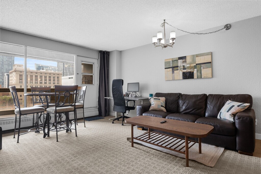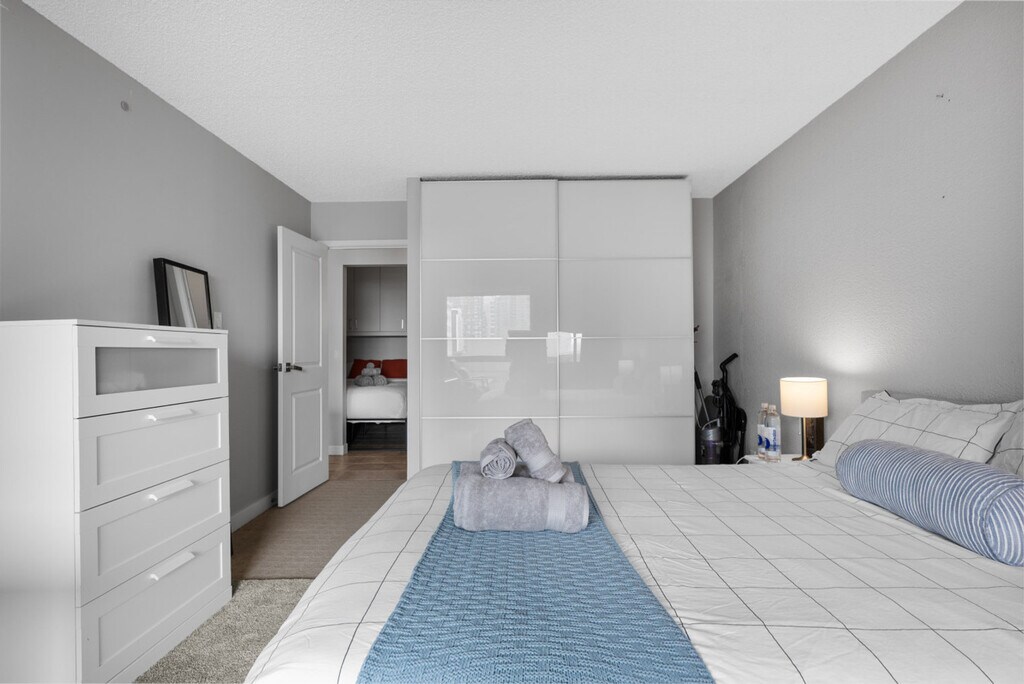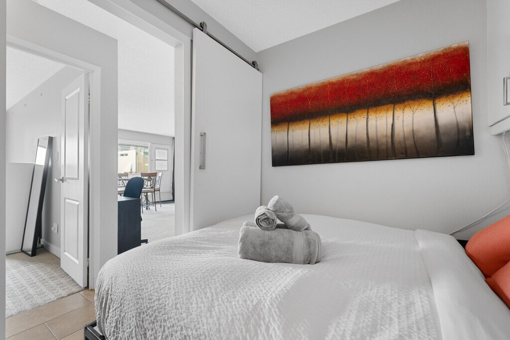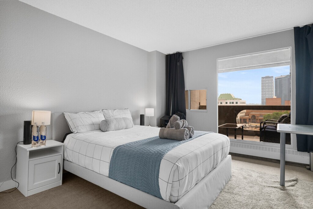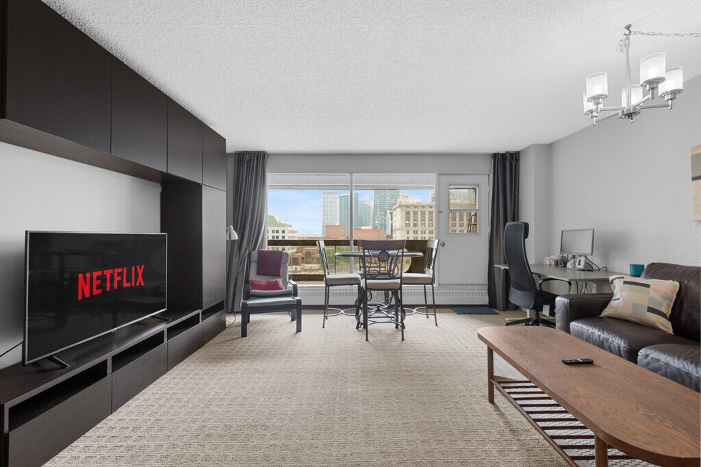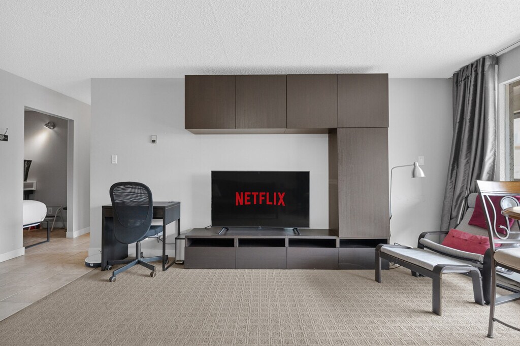 Feel at home in this cozy apartment on the 8th floor of Rocky Mountain Court, offering a perfect blend of comfort and convenience just steps away from downtown Calgary's top attractions. This apartment features a spacious bedroom with a queen bed and a den with another queen bed, a full bathroom, and a private balcony. The apartment is thoughtfully designed with a modern and inviting living room, complete with a 58” smart TV with Netflix and fast Wi-Fi. The fully equipped kitchen boasts stainless steel appliances, a 4-burner stove, oven, microwave, refrigerator, freezer, and dishwasher. Enjoy complimentary tea, coffee, and water, and make use of the in-unit washer and dryer. The apartment includes one free covered underground parking stall, with additional paid parking available in the area. Enjoy access to building amenities such as a fitness gym, dry sauna, and basketball and pickleball court. Located in a transit-friendly area, the Victoria Park/Stampede LRT Station is just steps away, offering quick access across the city. With a walk score of 97, everything you need is nearby, including the Calgary Public Library, City Hall, Arts Commons, and Olympic Plaza, all within a short walking distance. The neighborhood is also bike-friendly with designated bike lanes. Self check-in and check-out are available for your convenience. Smoking, vaping, and e-cigarettes are strictly prohibited on the property, with a $250 CAD fine for violations. Quiet hours are from 10 pm to 7 am to ensure a peaceful environment for all guests. Unauthorized late check-out will result in additional fees. Please remove outdoor shoes while in the home. The living room includes a comfortable sofa and an office desk with a chair, making it remote work-friendly with high-speed internet.