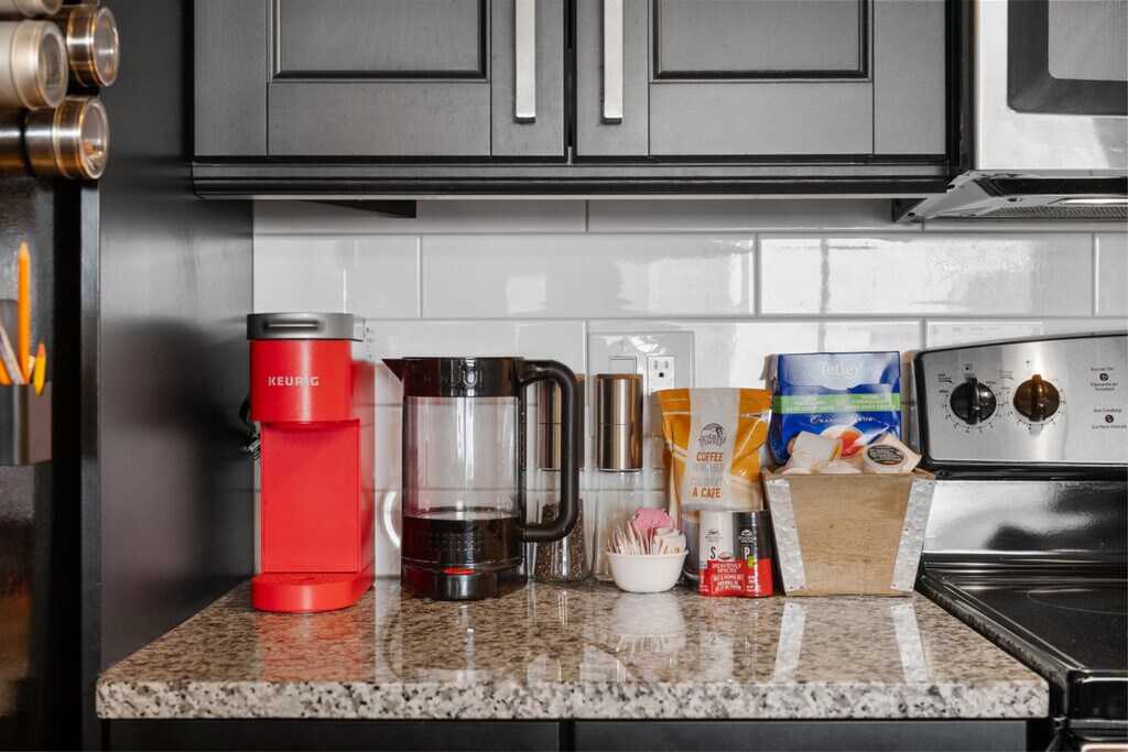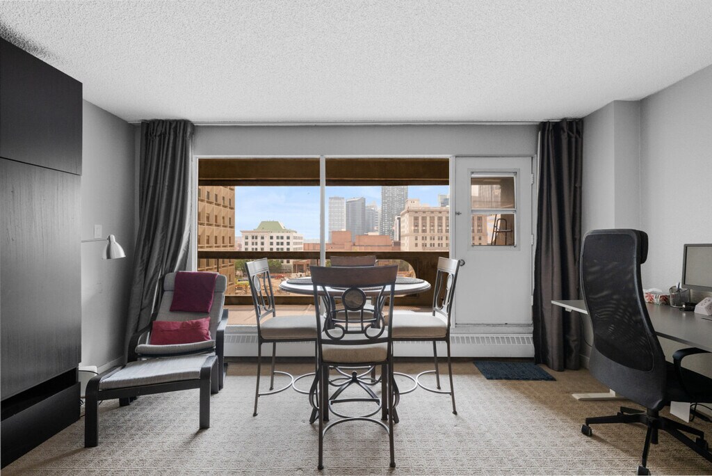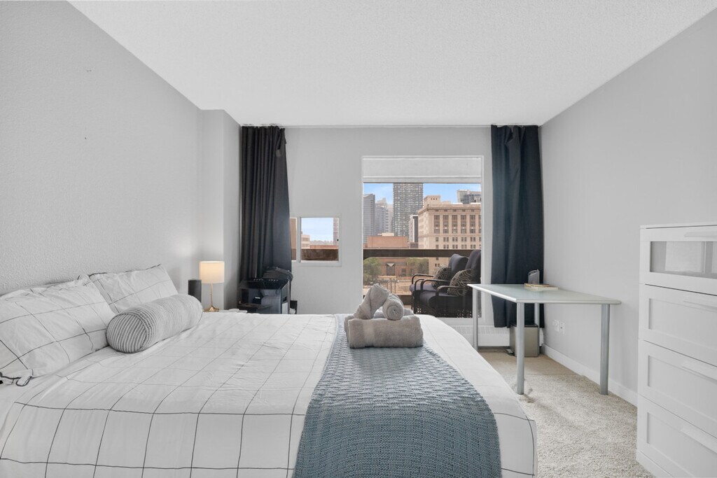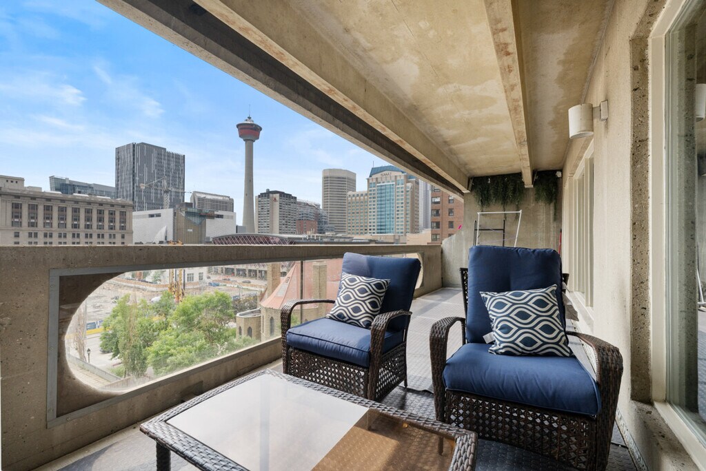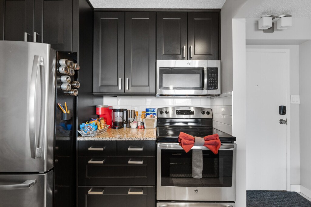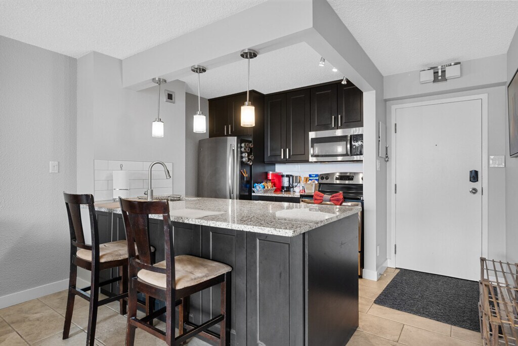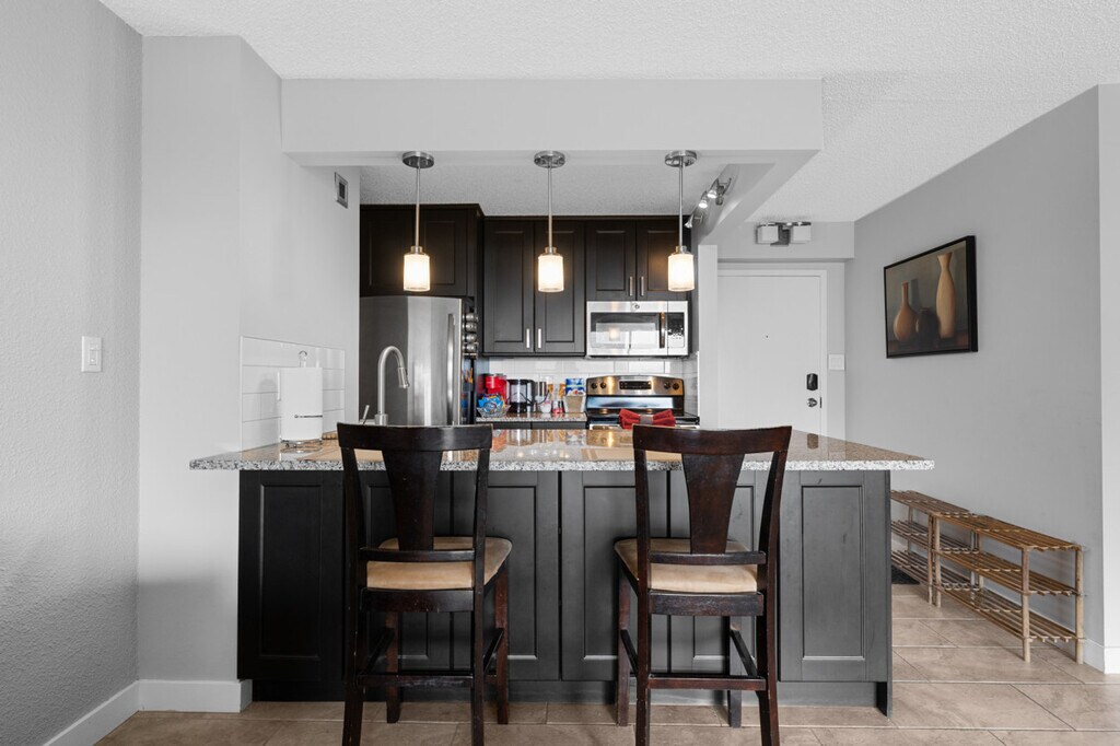 Feel at home in this cozy apartment on the 8th floor of Rocky Mountain Court, offering a perfect blend of comfort and convenience just steps away from downtown Calgary's top attractions. This apartment features a spacious bedroom with a queen bed and a den with another queen bed, a full bathroom, and a private balcony. The apartment is thoughtfully designed with a modern and inviting living room, complete with a 58” smart TV with Netflix and fast Wi-Fi. The fully equipped kitchen boasts stainless steel appliances, a 4-burner stove, oven, microwave, refrigerator, freezer, and dishwasher. Enjoy complimentary tea, coffee, and water, and make use of the in-unit washer and dryer. The apartment includes one free covered underground parking stall, with additional paid parking available in the area. Enjoy access to building amenities such as a fitness gym, dry sauna, and basketball and pickleball court. Located in a transit-friendly area, the Victoria Park/Stampede LRT Station is just steps away, offering quick access across the city. With a walk score of 97, everything you need is nearby, including the Calgary Public Library, City Hall, Arts Commons, and Olympic Plaza, all within a short walking distance. The neighborhood is also bike-friendly with designated bike lanes. Self check-in and check-out are available for your convenience. Smoking, vaping, and e-cigarettes are strictly prohibited on the property, with a $250 CAD fine for violations. Quiet hours are from 10 pm to 7 am to ensure a peaceful environment for all guests. Unauthorized late check-out will result in additional fees. Please remove outdoor shoes while in the home. The living room includes a comfortable sofa and an office desk with a chair, making it remote work-friendly with high-speed internet.