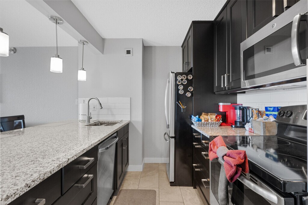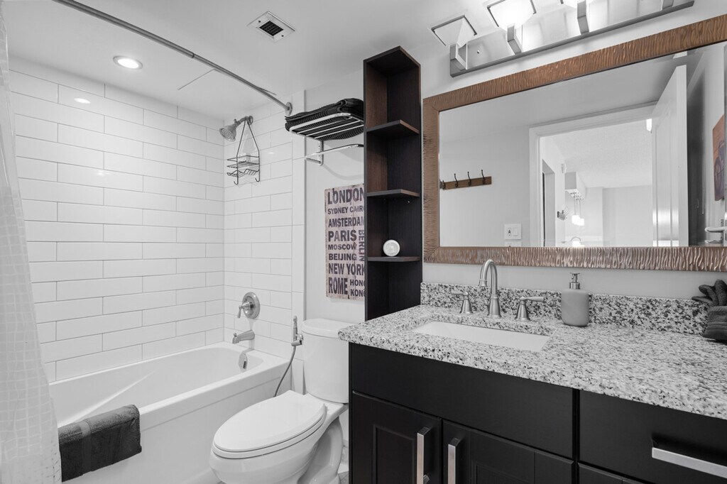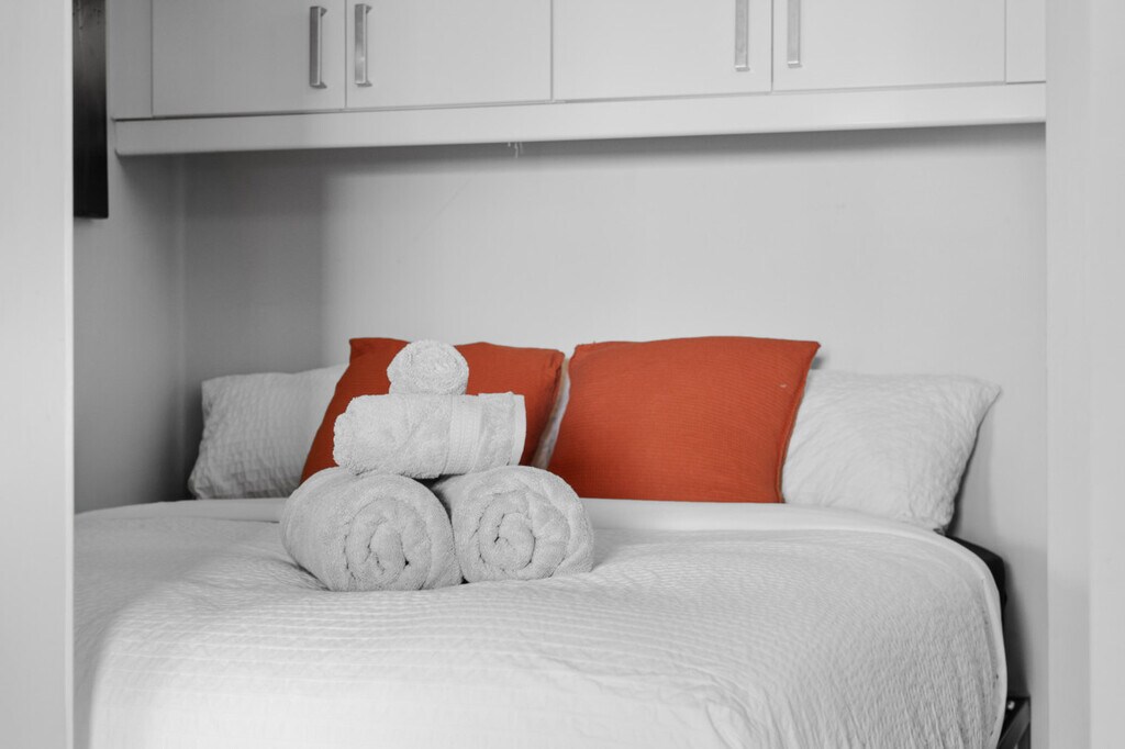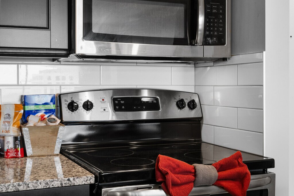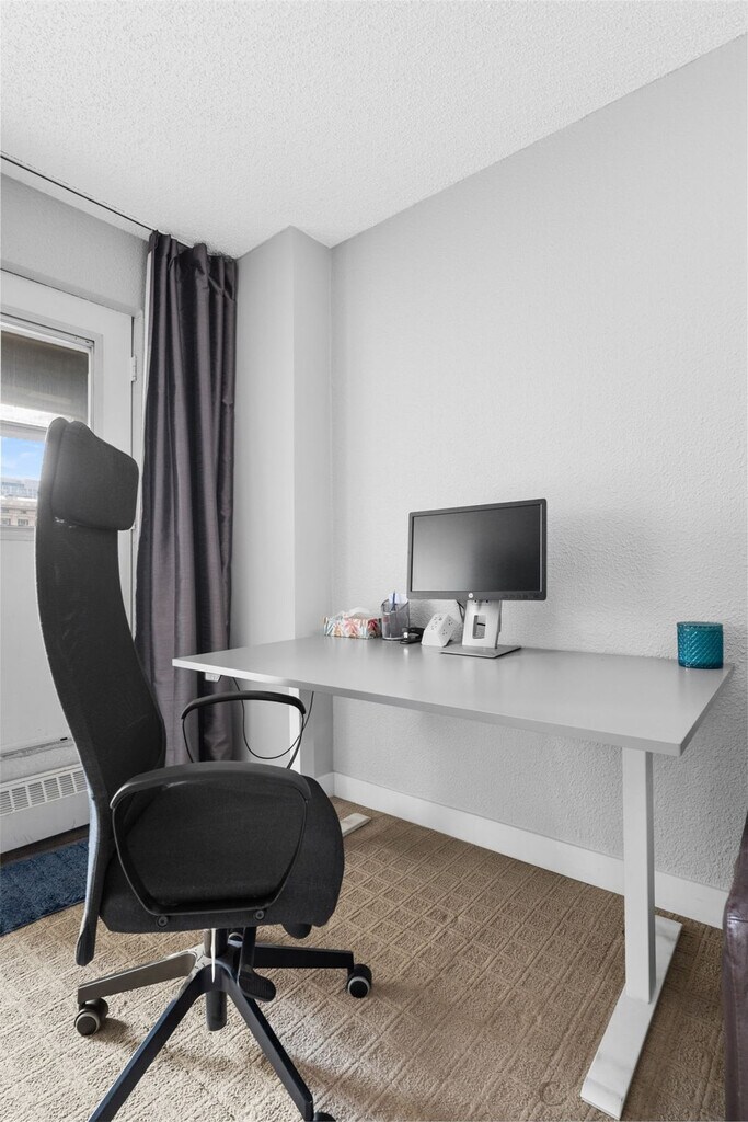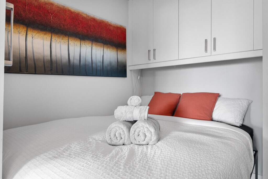 Feel at home in this cozy apartment on the 8th floor of Rocky Mountain Court, offering a perfect blend of comfort and convenience just steps away from downtown Calgary's top attractions. This apartment features a spacious bedroom with a queen bed and a den with another queen bed, a full bathroom, and a private balcony. The apartment is thoughtfully designed with a modern and inviting living room, complete with a 58” smart TV with Netflix and fast Wi-Fi. The fully equipped kitchen boasts stainless steel appliances, a 4-burner stove, oven, microwave, refrigerator, freezer, and dishwasher. Enjoy complimentary tea, coffee, and water, and make use of the in-unit washer and dryer. The apartment includes one free covered underground parking stall, with additional paid parking available in the area. Enjoy access to building amenities such as a fitness gym, dry sauna, and basketball and pickleball court. Located in a transit-friendly area, the Victoria Park/Stampede LRT Station is just steps away, offering quick access across the city. With a walk score of 97, everything you need is nearby, including the Calgary Public Library, City Hall, Arts Commons, and Olympic Plaza, all within a short walking distance. The neighborhood is also bike-friendly with designated bike lanes. Self check-in and check-out are available for your convenience. Smoking, vaping, and e-cigarettes are strictly prohibited on the property, with a $250 CAD fine for violations. Quiet hours are from 10 pm to 7 am to ensure a peaceful environment for all guests. Unauthorized late check-out will result in additional fees. Please remove outdoor shoes while in the home. The living room includes a comfortable sofa and an office desk with a chair, making it remote work-friendly with high-speed internet.