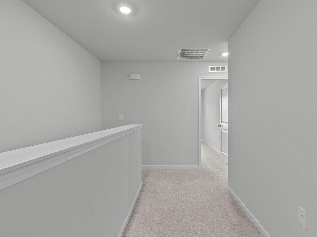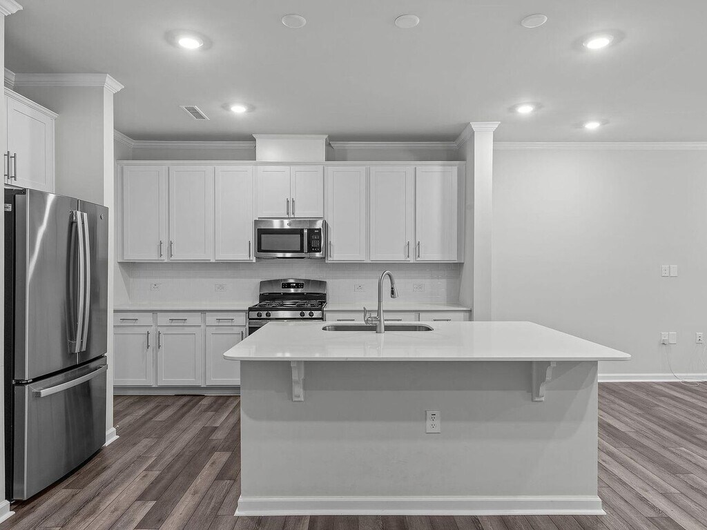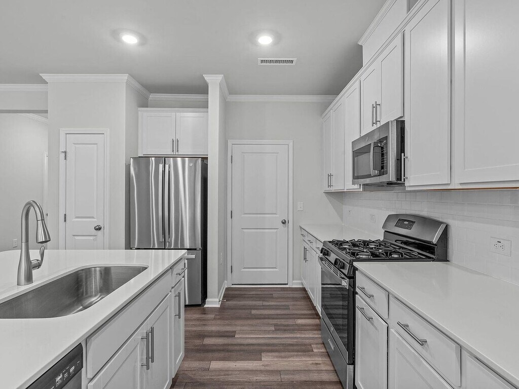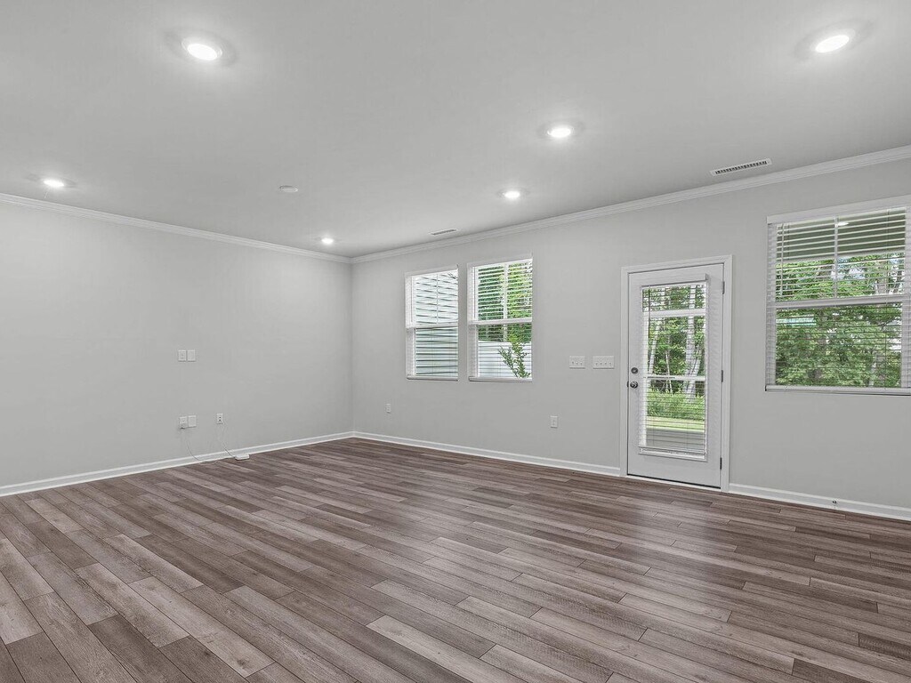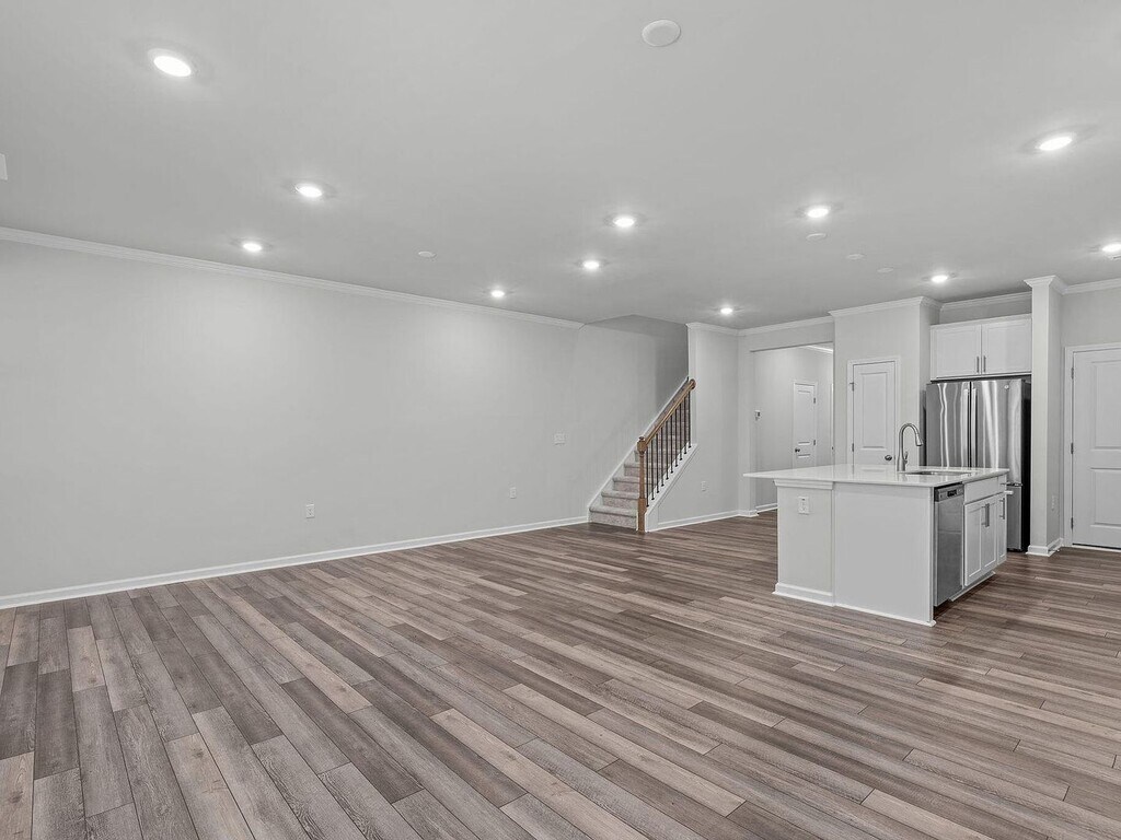 Like-new Carson II floor plan by Lennar in a completed community, move-in ready and packed with upgrades. Covered front porch, powder room entry, and an open kitchen, dining, and living area with luxury vinyl plank floors, crown molding, and LED lighting throughout the main level. Bright kitchen features white cabinetry, tile backsplash, quartz countertops, large island with stainless sink, pantry, and GE stainless appliances including gas range and refrigerator. Living room opens to a spacious screened porch with private wooded views. Upstairs offers an oversized primary suite with tray ceilings, walk-in closet, and ensuite bath with double vanity, tiled walk-in shower, and water closet. Two additional bedrooms with large closets, full hall bath with double vanity, and a separate laundry room with Samsung washer and dryer included. Window blinds throughout. Gas heat, one-car garage with power door opener and 240-volt plug. Enjoy community amenities including pool, dog park, playground, basketball court, picnic areas, walking trails, and green spaces. Convenient SE Raleigh location with easy access to downtown, highways, and everyday shopping.