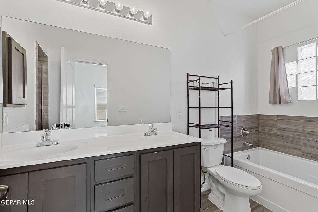 Welcome to a beautifully like new maintained 4-bedroom,2-bath home offering 1,615 sq. ft. of comfortable living space. Nestled in a quiet,family-friendly neighborhood,this home boasts an open-concept layout with a spacious living room,dining area,and a modern kitchen featuring ample cabinet space and sleek countertops. The primary suite includes a walk-in closet and a private garden tub,while three additional bedrooms offer versatility for guests,a home office,or a growing family. Enjoy tile flooring in main areas,carpeted bedrooms,and abundant natural light throughout. The backyard is perfect for entertaining or relaxing with a low-maintenance landscaping. Located near schools,parks,shopping,and easy freeway access. Don't miss your opportunity to own this move-in-ready gem in East El Paso!