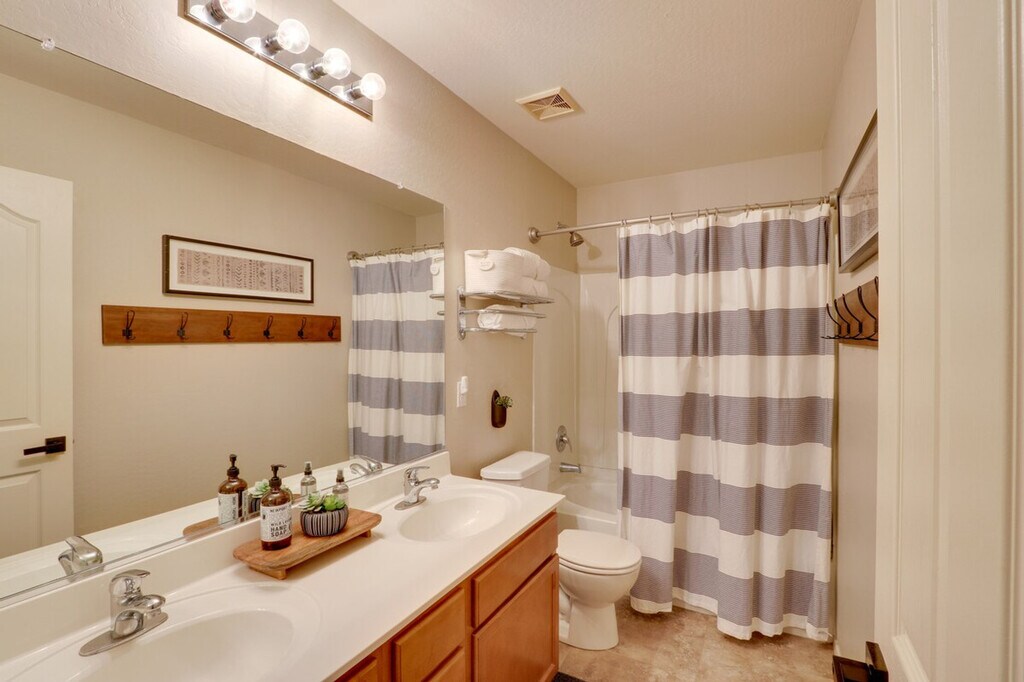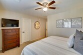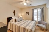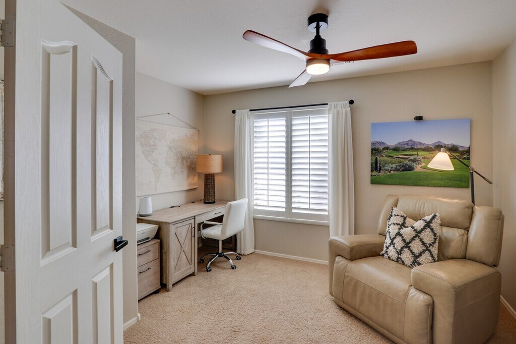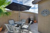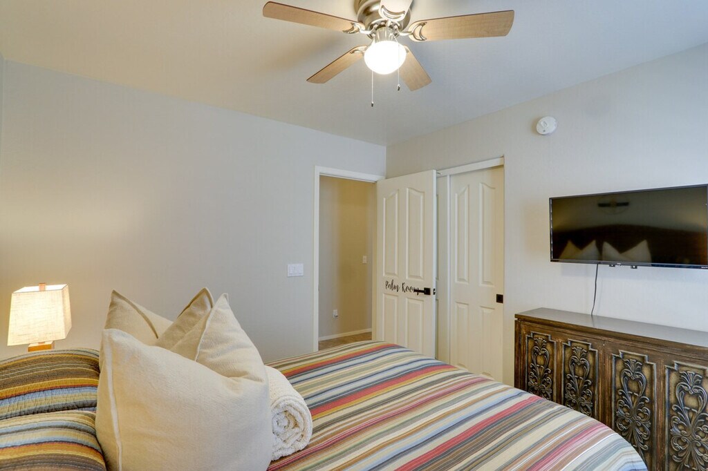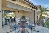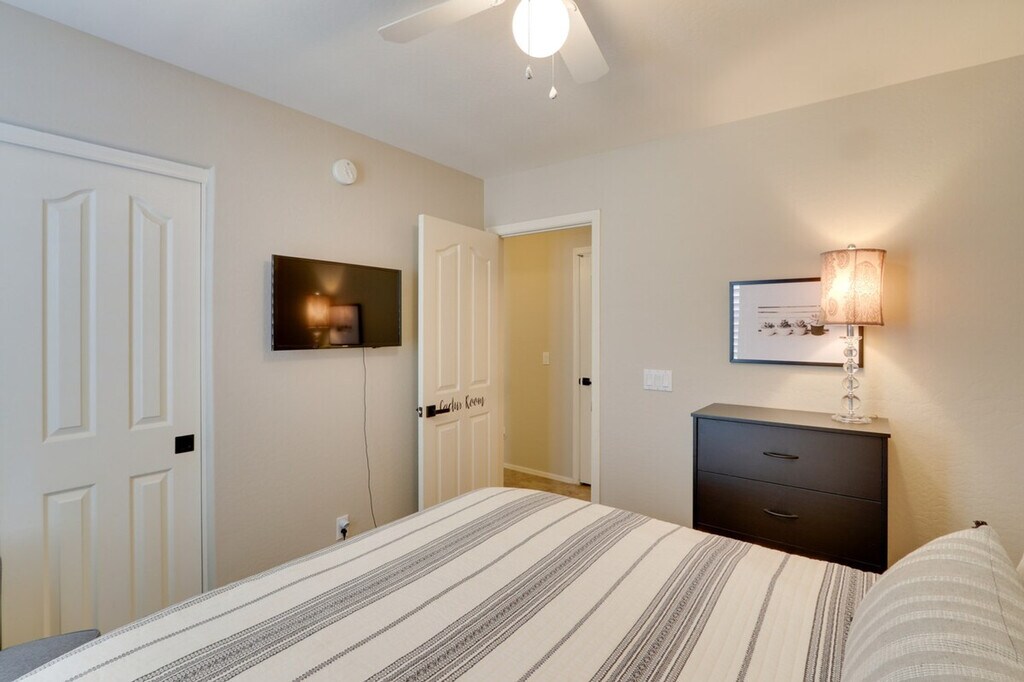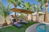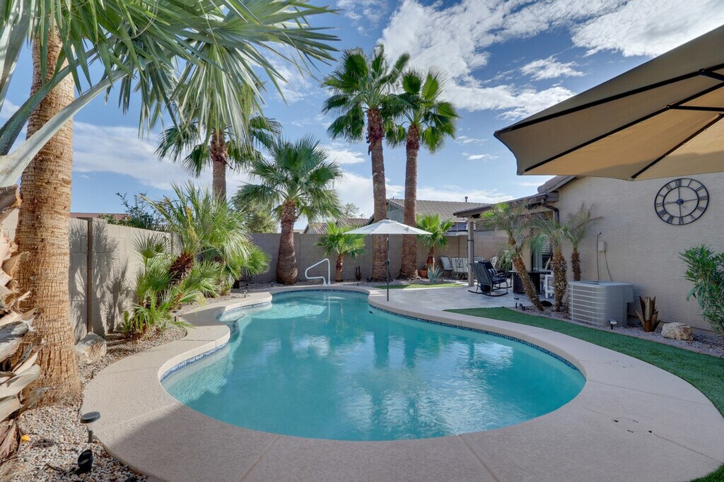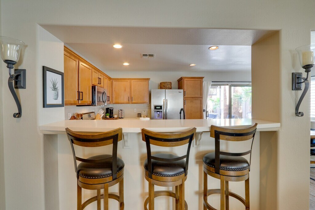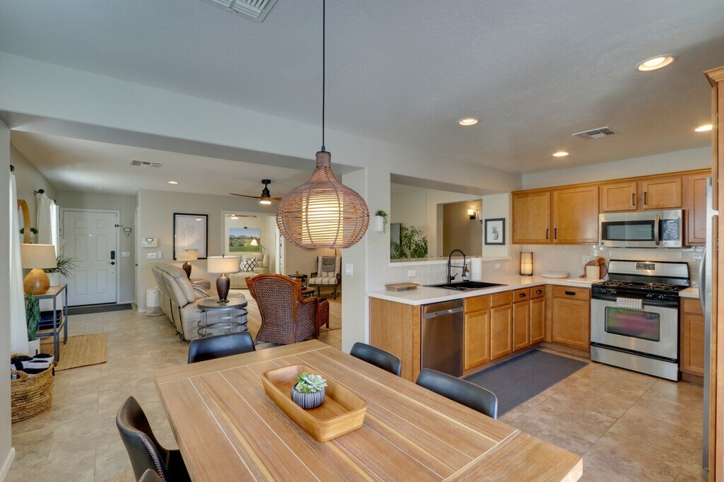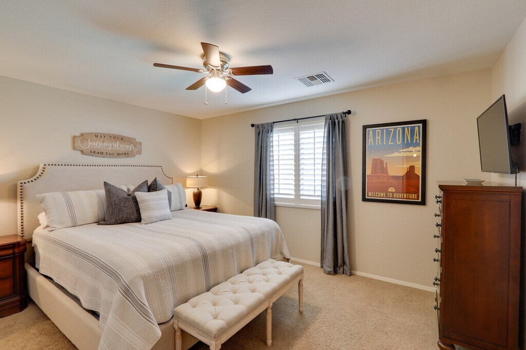 Feel at home in this well-appointed 3-bedroom, 2-bathroom vacation rental in sunny Maricopa, perfect for families seeking a comfortable long-term stay. This gem has comfort and convenience covered with amenities including a gas grill, stainless steel appliances, dishware and flatware, a Keurig coffee maker, cooking basics, an ice maker, a water filter, trash bags and paper towels, complimentary spices, a garbage disposal, free Wi-Fi, central heating and A/C, a washer and dryer, an iron and board, laundry detergent, towels and linens, complimentary toiletries, a hair dryer, hangers, board games, books, keyless entry, Smart TVs, a DVD player, a video game console, cable, ceiling fans, and a walk-in closet. There is an optional nightly pool heat fee of $25, plus fees and taxes, which is paid pre-trip and applied to the entire stay. Located in a golf community, this home offers easy access to afternoon tee times. Enjoy the backyard, complete with a heated pool, a covered patio, and comfortable lounge seating. Smoking, pets, events, parties, and large gatherings are not allowed. This property features 4 exterior security cameras: 1 camera is located on the front porch facing the porch and front yard, 1 camera is located above the garage facing the driveway, 1 camera is located on the side of the house facing the side yard, and 1 camera is on the back door facing the patio and backyard. The cameras are outward facing and do not look into interior spaces. The cameras do not actively record video or sound while guests are in residence. Includes an office with a dedicated workspace. [SI]