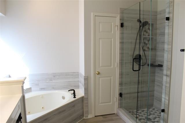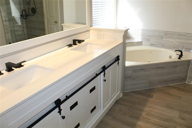 Unique, Light, Bright, and open floor plan,18’ ceiling, ready for move in. The family room with a fireplace, oversized ceiling fan, overlooks the spacious backyard. Half bath down. Kitchen includes: Island, stainless steel appliances, quartz countertops, stylish backsplash, refrigerator, walk in pantry & overlooks the back yard. Master suite, cathedral ceiling, double vanities, jetted tub, separate glass shower, walk in closet. Jetted tub in the upstairs bathroom. This is a must see.