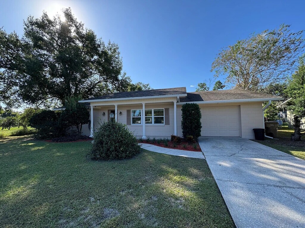 Ride bikes to downtown Mt. Dora! This beautifully updated home is ready for you! Step inside and enjoy a brand-new, open-concept kitchen featuring quartz countertops, solid wood cabinets, and stainless steel appliances perfect for cooking and entertaining. The inviting front porch welcomes you into a bright and spacious living area with fresh paint and easy-to-maintain tile flooring. The home's bedrooms feature new luxury vinyl plank floors, and both bathrooms have been thoughtfully renovated for modern comfort. The open floor plan flows seamlessly from the front door through the living room, dining area, and Florida room creating a wonderful connection to the private backyard. Large windows at the front and back of the home fill the space with natural light, and energy-efficient windows (replaced in 2020) help keep utility costs down. Additional features include newer architectural shingles, A/C system, and drain field, offering peace of mind and reliability. Located in a charming neighborhood with sidewalks, mature trees, and streetlights, this home is walking distance to an elementary school, shopping, and a scenic park with a walking trail around Lake Gertrude. Just minutes from historic downtown Mount Dora, where you'll find local dining, boutiques, and year-round festivals.