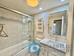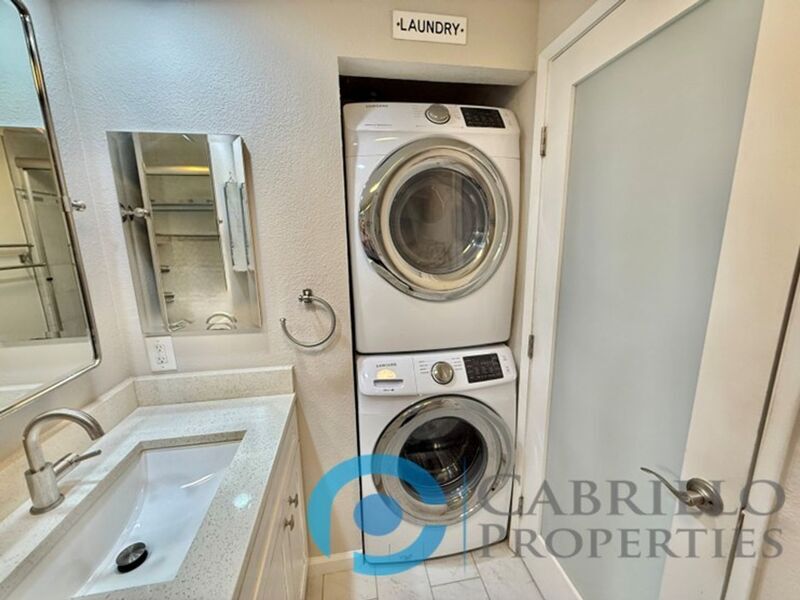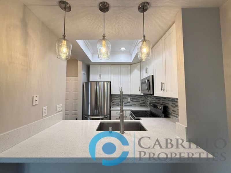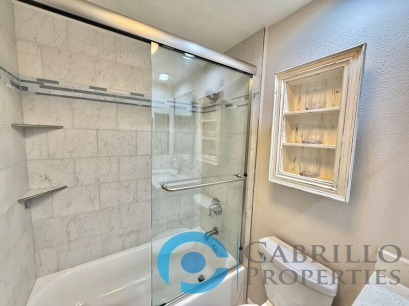 Welcome home to this stylish first-floor 1 bedroom, 1 bathroom condo in the Creekwood at River Run community. This unit has been tastefully upgraded, blending modern finishes with comfortable living. Step into a bright, open concept living space featuring hardwood flooring throughout the main areas and plush carpet in the bedroom. The kitchen is a true showstopper, boasting white shaker cabinets, quartz countertops, a glass tile backsplash, and stainless-steel appliances, including an electric range, refrigerator, microwave, and dishwasher. Recessed and pendant lighting create a warm, inviting atmosphere perfect for cooking and entertaining. The living room offers a cozy fireplace and access to a private outdoor patio, ideal for relaxing or enjoying a morning coffee. The bathroom is equally impressive with a bathtub surrounded by marble tile, matching white shaker cabinetry, quartz counters, and modern recessed lighting. Community Amenities: Enjoy the beautifully maintained grounds featuring tranquil water features, lush professional landscaping, and resort-style amenities, including a pool, spa, and fitness center. Prime Location: Conveniently located just one block west of Costco and Ikea, this home is within walking distance to shopping, restaurants, and the Mission Valley River Walk. With easy access to freeways, this location makes commuting a breeze. Don’t miss the opportunity to make this upgraded condo your new home in the heart of Mission Valley! Small pets allowed with restrictions and $50/month pet rent per pet. Tenant pays all utilities. One covered off-street parking space, plus one guest pass. To set up a showing please call or go to: Cabrillo Properties BRE#02066091 814 Morena Blvd Suite 101 San Diego, CA 92110 - Leasing To view the 3D Walkthrough: