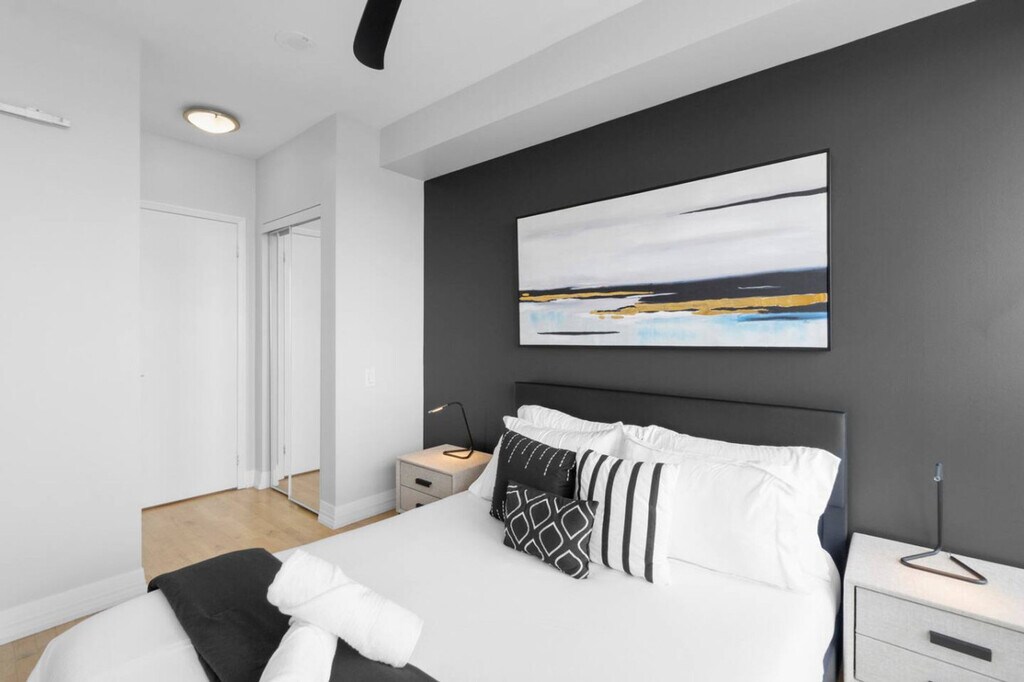 The advertised rate of C$5,848/month is the lowest available price, based on a 30 day(s) stay with a move-in date of March 14, 2027. Rates vary depending on the duration of stay, season, and other parameters. For exact pricing and additional pricing components, please visit our website and enter your desired move-in and move-out dates. The rate is applicable when billed upfront; it can be higher if billed in multiple payments. Feel at home in this spacious 2-bedroom unit located in the heart of Toronto, with panoramic skyline and CN Tower views. This apartment features high-speed fiber internet, a balcony with outdoor seating (available seasonally), full sets of hotel-quality bedding, fresh towels, a fully equipped kitchen with appliances including a fridge and stove, and an in-suite washer and dryer. Please note that this space does not have a TV or living room. One free parking spot is included. With a walk score of 100 and a transit score of 100, this apartment is excellently located just a 1-minute walk to College/Yonge subway station and offers easy access to the CN Tower, Metro Toronto Convention Centre, Rogers Centre, Scotiabank Arena, and Union Station. The hallway outside of the unit is currently being renovated (non-structural cosmetic upgrades). There is no noise, but as it's currently unfinished, it may appear unsightly. Smoking is not allowed anywhere on the premises, and failure to comply may result in a penalty up to $1000. No more than the stated number of guests in the reservation may stay overnight, unless agreed otherwise. Failure to report the accurate number of overnight guests may result in an immediate cancellation of your stay. Pets, parties, and illegal drugs of any kind are not allowed anywhere on the property (inside or outside). [SI]