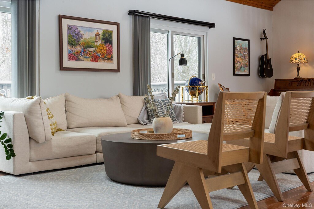 Set on 8 private wooded acres across from protected state land with miles of trails,this fully furnished contemporary home offers privacy,natural surroundings,and flexible living in the Hudson Valley. Located on a quiet country road,it’s ideal for remote work,seasonal stays,or extended escapes from the city. Available April 1 with lease terms from 3–18 months. Open and airy,the home features soaring ceilings,hardwood floors,and a bright contemporary layout. The main living space highlights a striking two-sided stone fireplace,with skylights and sliding doors that open to the outdoor deck areas,creating a natural indoor-outdoor flow perfect for entertaining or relaxing evenings by the fire. The main house includes two bedrooms,a full bathroom,and workspace upstairs,plus a downstairs den with bunk beds for additional sleeping space. Outdoor spaces feature a rear deck with grill,tiered front decks,and a fire pit area,perfect for enjoying the peaceful surroundings. A separate studio above the detached garage provides additional flexibility,with a queen bed,pull-out sofa bed,and full bath. Conveniently located close to the Village of Montgomery and within 30 minutes of Minnewaska State Park,Mohonk Preserve,local wineries,and farm-to-table restaurants,with shopping and dining in Middletown just minutes away. Easy access to I-84 and Route 17,and approximately 90 minutes from NYC. Fully furnished rental available April 1 with flexible lease terms from 3–18 months. Based on information submitted to the MLS GRID as of [see last changed date above]. All data is obtained from various sources and may not have been verified by broker or MLS GRID. Supplied Open House Information is subject to change without notice. All information should be independently reviewed and verified for accuracy. Properties may or may not be listed by the office/agent presenting the information. Some IDX listings have been excluded from this website. Prices displayed on all Sold listings are the Last Known Listing Price and may not be the actual selling price.