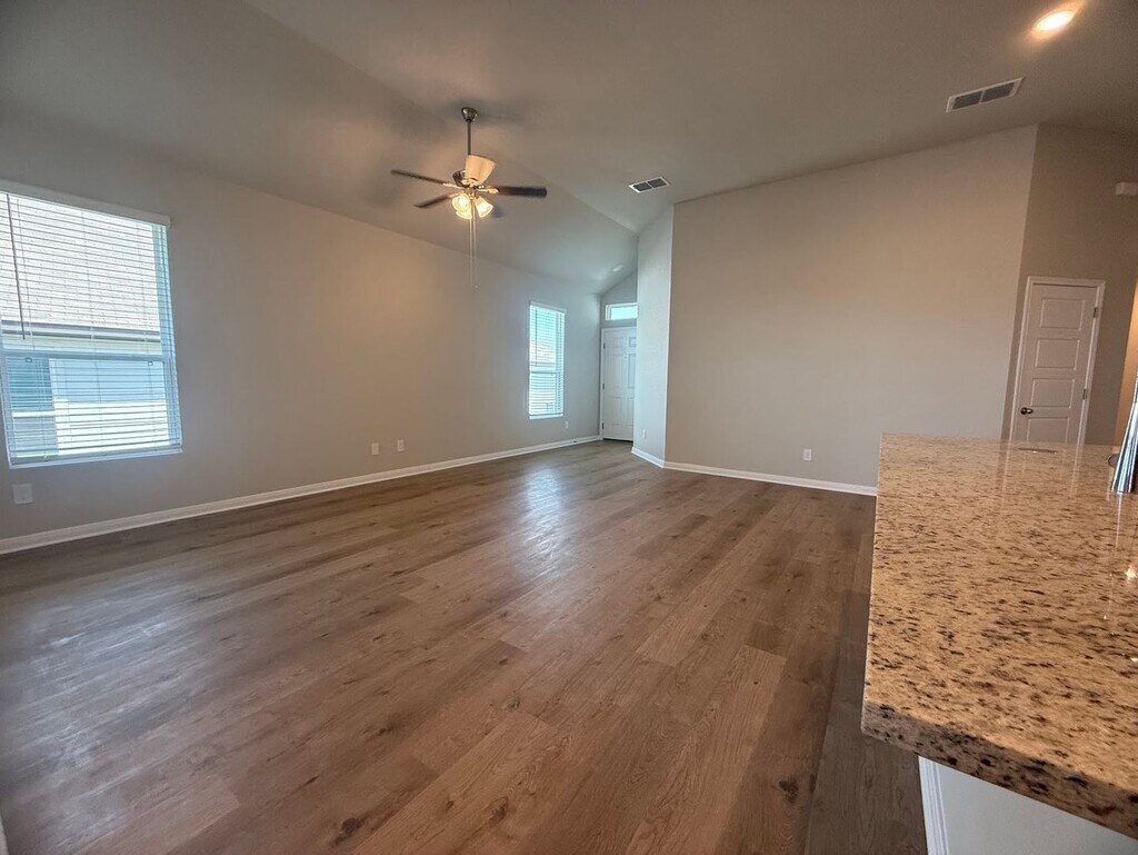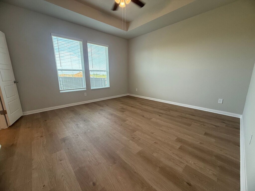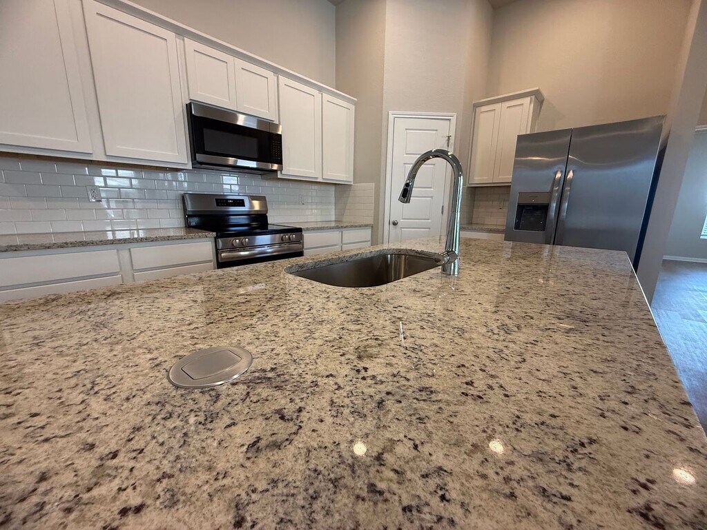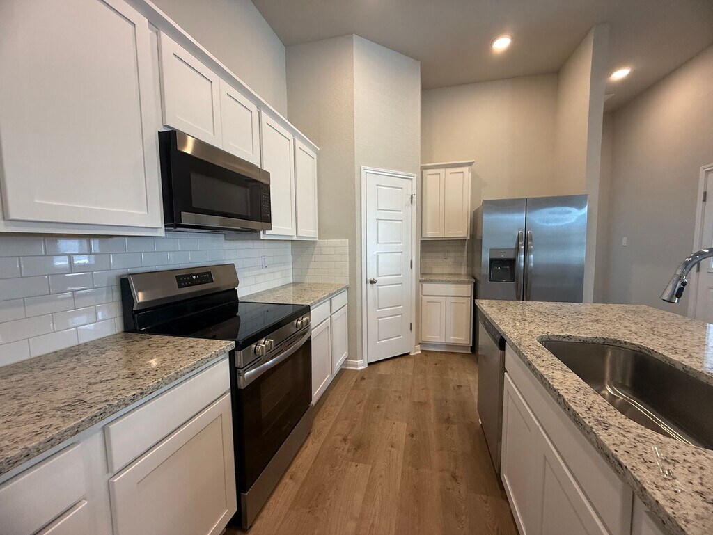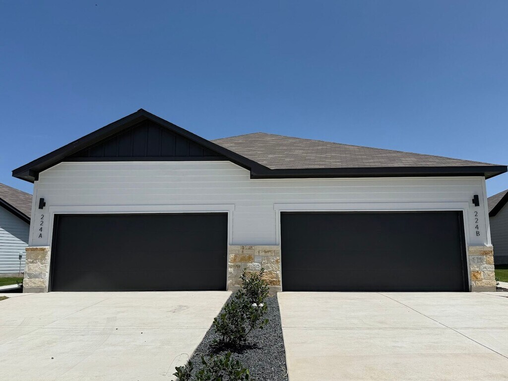 This beautifully designed 3-bedroom, 2-bathroom duplex features just under 1500 sq. ft. of ample living space, boasting an open-concept layout, hardwood laminate flooring, and soaring 11-foot ceilings. Large windows throughout provide excellent natural light in every room. A stunning chefs kitchen includes; stainless steel appliances, granite counter tops, large kitchen island, stylish tile backsplash, and sleek white cabinetry. The spacious primary bedroom, located on opposite end of the home from the secondary bedrooms, features an ensuite bathroom including granite counter-tops, double vanity, generous cabinet storage, and a luxurious walk-in shower. The expansive walk-in closet is sure to impress, offering more than enough space for all your needs. Just off the garage, you’ll find a practical and stylish drop zone—perfect for organizing your daily essentials. Every inch of this home is designed with functionality in mind and smart storage solutions throughout. This property has added bonuses of LVP throughout (no carpet anywhere) and ceiling fans in all the bedrooms! Start and finish your day on the private patio looking out to a spacious, fully fenced backyard. Perfect for enjoying the breathtaking open skyline. Located just 15 minutes south of downtown Austin via I-35, this prime location also offers easy access to Kyle, San Marcos, and New Braunfels. Don't miss this opportunity to experience living the perfect blend of style, comfort, and convenience at Emma Park!