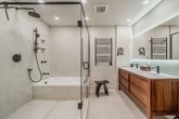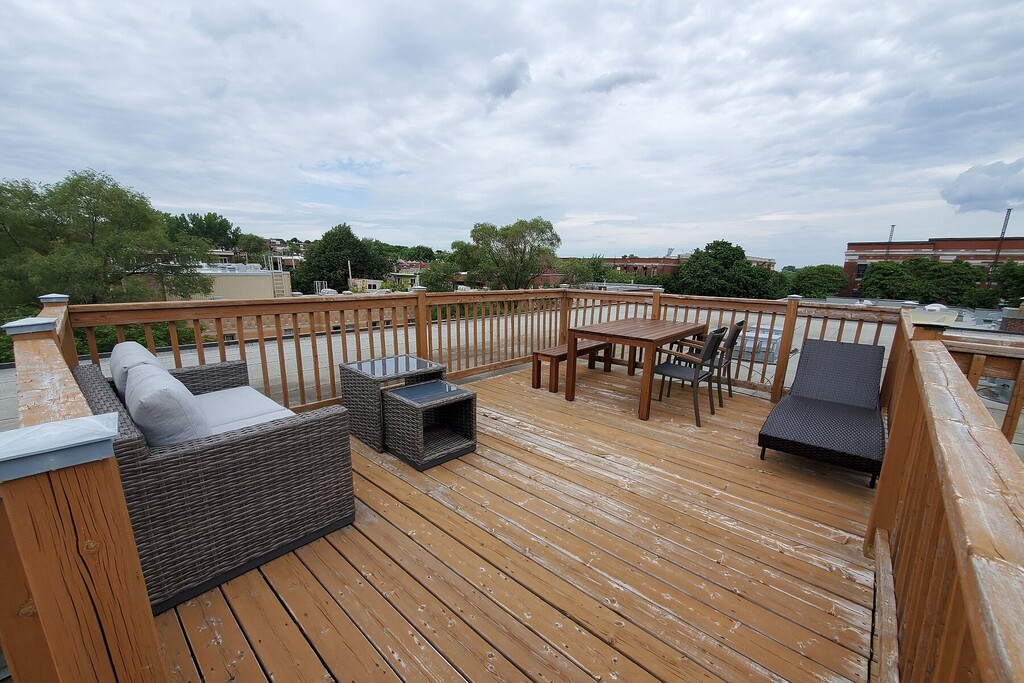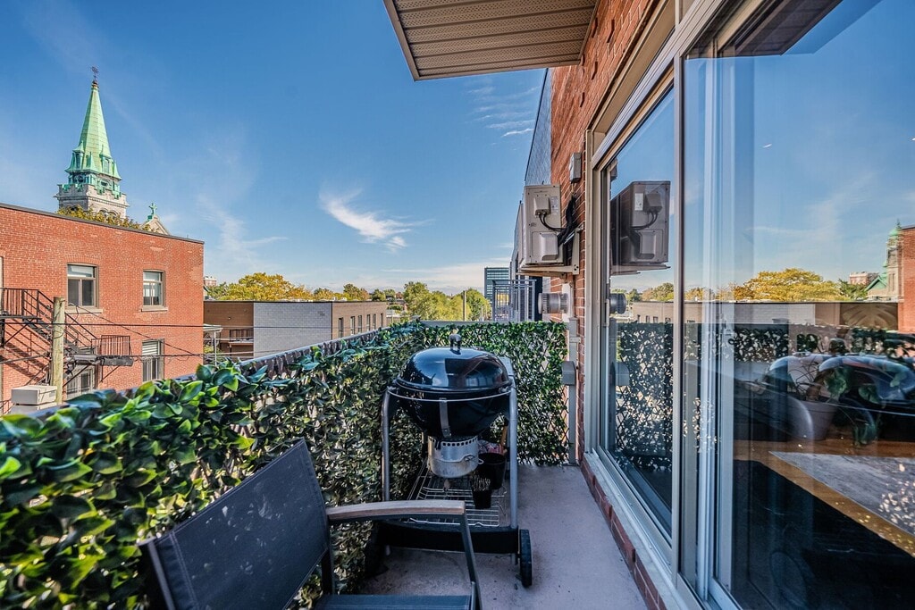 Spacious furnished apartment located in Central Montréal. With nearly 1,400 sq. ft., it offers 2 bright and comfortable bedrooms, along with a versatile den that can serve as an office or additional bedroom. The living room, adjacent to the dining area, opens onto an inviting open-concept space. The functional kitchen includes a breakfast counter and ample storage. The bathroom is stunning, with a glass-enclosed shower and separate tub. Warm wood floors and high ceilings create an airy atmosphere. Just minutes from local shops, restaurants, Frontenac metro, and Downtown, a perfect urban lifestyle.
