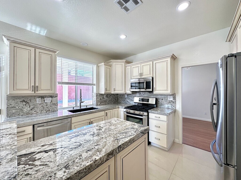 Corner-lot home in the heart of Summerlin! This renovated two-story features 4 bedrooms, 2.5 baths, fresh interior paint, new carpet, and a new shower door. The kitchen offers granite countertops and a center island, perfect for everyday living and entertaining. Exterior paint completed in 2023. Enjoy a spacious, private backyard. Price includes $50 a month for trash & sewer.
