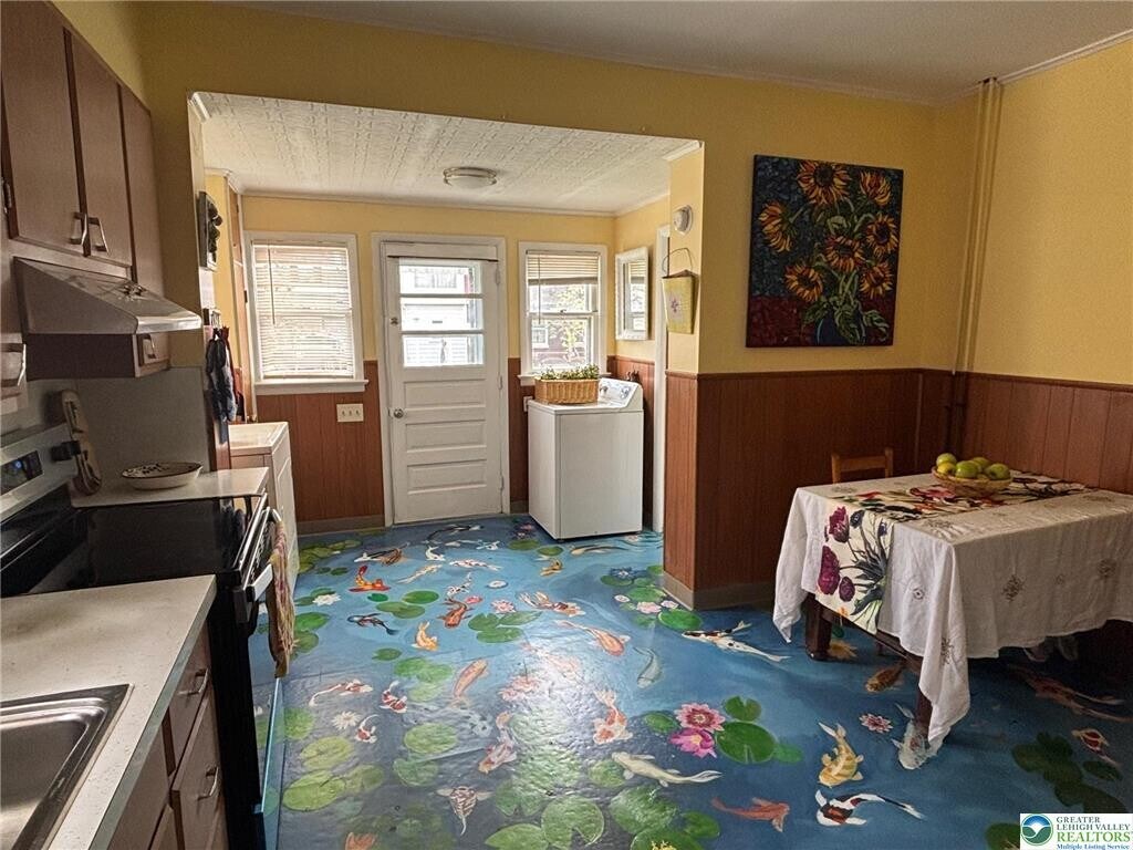 Charming 3-Story Home with Unique Artistic Touches and Garden Space Located in the desirable Wilson Borough School District, this spacious and thoughtfully updated home offers three full floors of living space plus a full basement. The main level features a living room, chandelier-lit dining room, and a large kitchen with a unique hand-painted koi pond floor mural created by some of the Valley's leading local artists. A half bath and convenient first-floor laundry are included, along with a dishwasher, electric range, microwave, and refrigerator with an icemaker. Just off the kitchen is a small backyard with garden space—perfect for enjoying outdoor time without extensive maintenance. The covered front porch provides a welcoming sitting area, and the front yard features a mature apple tree. The second floor offers three bedrooms, including a primary bedroom with a built-in window seat, cedar closet with drawers, and additional storage. The full bath includes a tub/shower and distinctive river stone flooring. Two additional bedrooms provide flexibility for family, guests, or workspace. The third floor includes two separate areas and offers versatile living space ideal for a bedroom suite, office, studio, or additional living area. Recent updates provide a clean, refreshed interior while maintaining the home’s character and charm. Artistic details throughout reflect the home’s unique personality. Additional Features: Oil heat (ducted system) Window A/C units available Basement for storage Backyard garden area The home can be rented furnished or unfurnished (details to be discussed). Certain decorative items and specific furniture pieces are excluded. Tenant responsible for cable, electric, water, lawn care, snow removal.