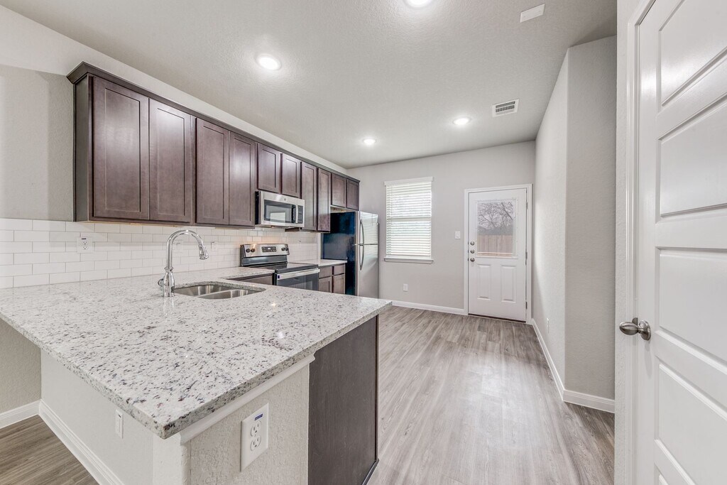 Lovely 2-story duplex home in a great neighborhood. Features an open concept floor plan with stainless steel appliances and wonderful countertops with eat-in bar. The primary bedroom is downstairs and features an attractive bathroom complete with walk-in shower, separate vanities, and large walk-in closet. The 2 sizable bedrooms upstairs do not share walls with each other or any living areas. Ceiling fans in all bedrooms. Office nook at the top of the stairs. Walk-in attic access with decked storage space and full size door. The covered patio is located off the kitchen. Great backyard with privacy fence. Automatic lawn sprinkler system. 2-car garage with opener. Built in 2023. Located minutes from the quaint eclectic downtown of Cibolo. Schertz-Cibolo-Universal City ISD. Easy commute to JBSA Randolph AFB, San Antonio and New Braunfels.