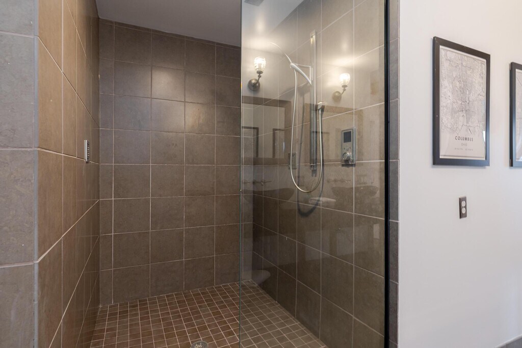 This urban condo is not your typical downtown drywall box. Originally a shoe factory,this iconic building was reimagined in 2006 into a boutique loft community that blends historic character with modern design. This southwest-facing condo is located in the original building and delivers a true urban-loft vibe with reclaimed hickory floors,exposed brick,post-and-beam construction,and soaring ceilings. Sunlight pours in from every angle,with skyline views from nearly every room and a private balcony to take it all in. The oversized one-bedroom layout features an open,flexible floor plan anchored by a sleek kitchen with Studio Becker cabinetry in a contemporary cherry finish,new black granite countertops,a large seating island,and stainless steel appliances—perfect for entertaining or everyday living. The spa-inspired bathroom elevates daily routines with a double vanity and a dramatic 5' x 5' glass-and-tile shower with six shower heads. Modern perks include in-unit laundry with full tied stackable washer & Dryer,secure attached garage parking with an EV charger,elevator access,and dedicated storage. Set in the heart of the Discovery District,you're steps from Wolf's Ridge Brewing,Jackie O's,and the Gay Street arts corridor,with the Short North just a quick 0.7 mile walk away. Urban living with history,style,and energy. Roof 2020,HVAC 2023,Water Heater 2025.