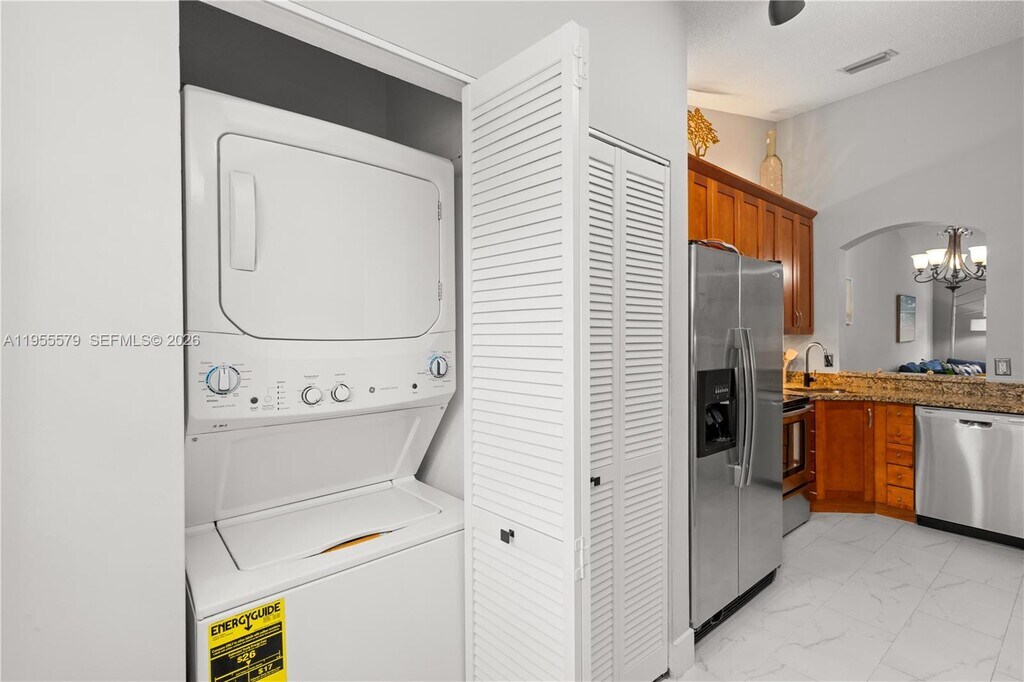 Beautifully updated 2 bedroom 2 bath condo offers a spacious living room and dining area. Located on the second floor, it features vaulted ceilings making it an open concept. This unit is designed with porcelain tile throughout, completely remodeled bathrooms, and impact windows. The kitchen is equipped with a new dishwasher, microwave, refrigerator, and a newer washer and dryer. The community offers a pool and play area for kids. MLS # A11955579