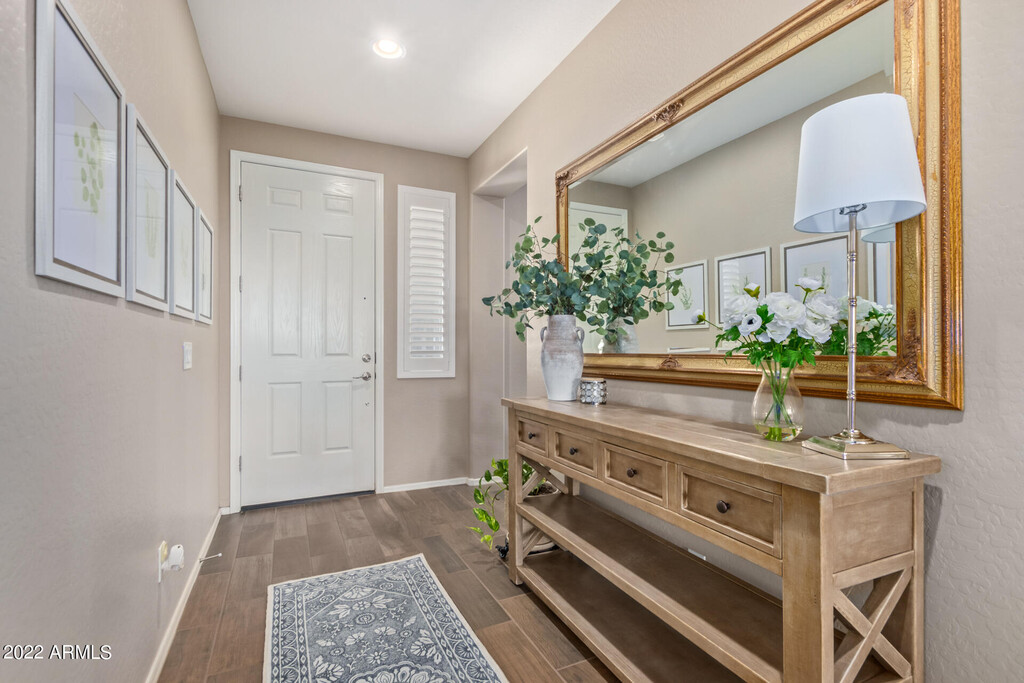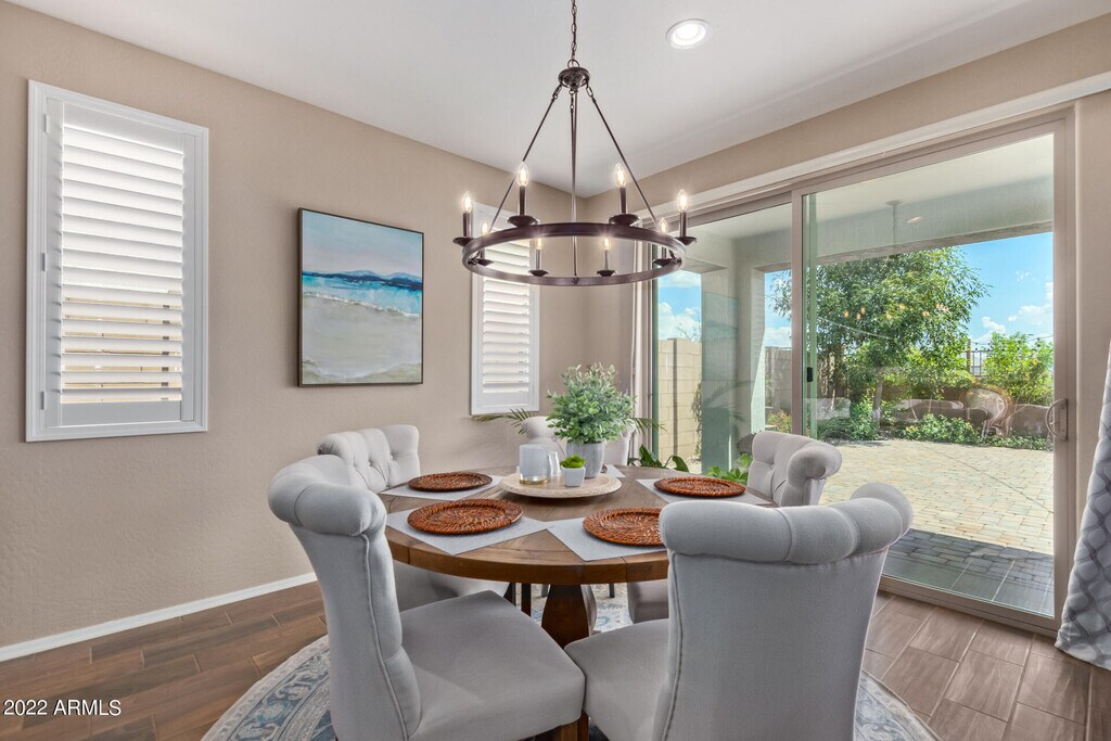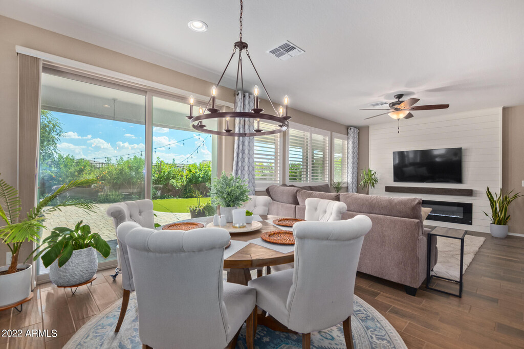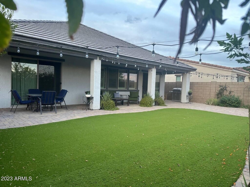 All Inclusive! Come feel at home for an incredible extended stay in this newer CONTEMPORARY FARMHOUSE located in the popular Meridian community in Queen Creek w/resort style amenities. Beautiful,comfortable,3 BR/2 BA home fully furnished with a King bed,Queen adjustable bed and your choice of a full bed or a desk for an office. Featuring an open split Floor Plan with high ceilings,abundant natural light,chef's kitchen,luxuriously comfortable beds,and exceptional outdoor living space. The casual style is combined with designer finishes like premium wood-look tile flooring throughout,plantation shutters,iron security door,upgraded light fixtures,modern gas fireplace and custom landscape design. The inviting entry opens to the main living area professionally decorated Kitchen has granite countertops w/over sized island/breakfast bar,SS appliances,convection oven,glass cooktop,large pantry and ample cabinets full of dishes,cookware,small appliances,and everything you may need. The main ensuite bedroom is split w/ large walk-in closet,his and hers sinks,a huge glass enclosed shower,private toilet room,and backyard entry. The second and third bedrooms are generous (10x15),with one set up as an office (Or a full size bed is available) and the other has an adjustable Queen bed w/walk-in closet and access to their own bath. Other highlights include reverse osmosis,water softener,inside laundry w/ LG front loader washer & dryer,epoxy garage floor,ceiling fans t/out,and flat screen smart TV's in 2 of the bedrooms and great room. This beautiful home is situated on a premium lot,fully fenced and backing to a common area,private with many mature plants,pavers,and premium artificial turf. Also has special lighting,comfortable outdoor furnishings,a propane gas grill,and a small dog run w/doggie door. ALL Utilities and Amenities are Included! Meridian is a recently completed community with a prime location in the heart of of Queen Creek. It is perfect with tree-lined streets,pedestrian-friendly sidewalks,walking,biking,and equestrian trails,and a variety of resort-style amenities including a 5000 sq ft community pool,a splash pad with water features,several parks with playgrounds,basketball courts,green belts,community gardens,and an outdoor movie ramada. Close to highly rated public schools,shopping,and dining. Olive Mill 1.5 miles,New Frontier Family Water Park 2.7 miles,Queen Creek Marketplace 4 miles,Mansel Carter Oasis Park 6 miles,Legacy Sports Complex 7 miles,Mesa Gateway Airport 7 miles,and SR24/San Tan Freeway 7 miles Do not miss this gorgeous All-Inclusive home for lease!