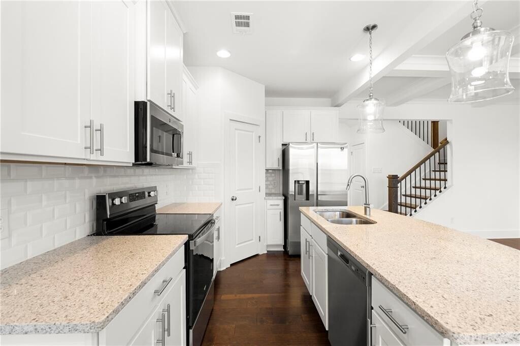 Welcome to this stunning,move-in ready townhome showcasing thoughtfully curated design elements throughout. This bright and spacious 3-bedroom,2.5-bath home features a freshly painted interior and professional staging that highlights its open-concept layout and modern finishes. The main level boasts a sleek kitchen with granite countertops,crisp white cabinetry,stainless steel appliances (including a side-by-side refrigerator),and beautiful hardwood floors. Stunning ceilings highlight the beautiful living room. Upstairs,a large versatile loft offers the perfect flex space,ideal as a second living area,home office,or playroom. The luxurious primary suite includes a walk-in closet,double vanity,and a separate soaking tub and shower. Two additional generously sized bedrooms and a full bath complete the upper level. Enjoy the convenience of an attached 2-car garage plus a driveway with space for two more vehicles. The fully fenced backyard is perfect for pets or outdoor relaxation. Located in a beautifully maintained new community in Lithonia,just minutes from I-20,Covington Hwy,shopping,and grocery stores. Lawn care is included through the HOA. MLS ID 7696966