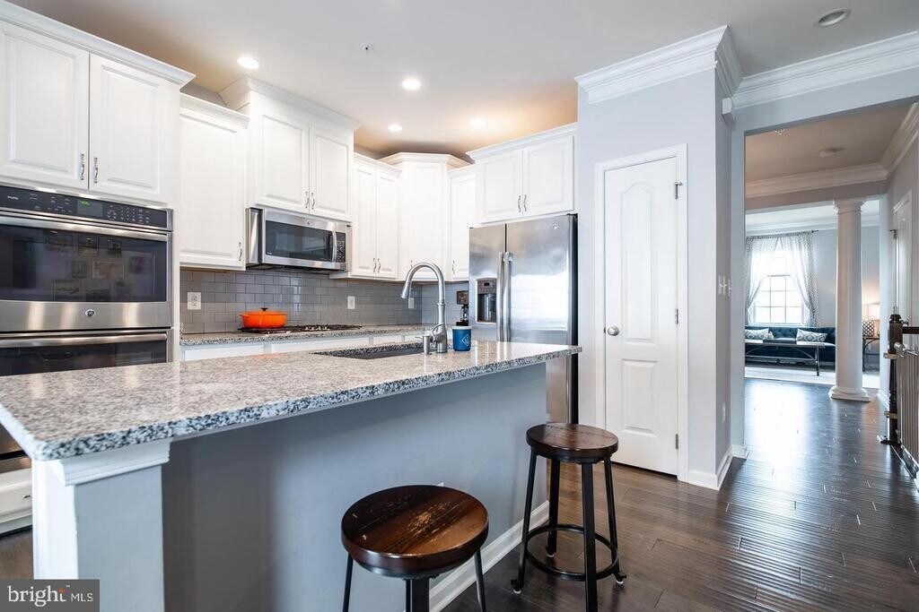 4 bed / 3.5 bath townhome in the sought-after Moorefield Station community! Built in 2015, this spacious home offers over 2,800 square feet of upgraded living, including freshly painted interiors and new carpets in all bedrooms, granite countertops, stainless steel appliances, a large double oven, crown molding, dual HVAC systems, and an oversized 2-car garage. The first level features a full bedroom with an attached full bath—perfect for visitors, in-laws, or an au pair suite. The second level offers two generous living areas, an open kitchen, and a large patio/deck ideal for grilling and entertaining. The third floor includes three large bedrooms, two full baths, and a walk-in closet in the primary suite. The fourth level is an entertainer’s dream, complete with a built-in bar, a spacious living area with built-ins, and an all-weather rooftop deck. Located directly across from the community amenities—including a pool, club room, fitness center, and park. Minutes to the Ashburn Metro Station, shopping, Route 267/Toll Road, Washington-Dulles Airport, and highly sought-after Loudoun County Schools. Ample visitor parking available in front of the home and throughout the community. Don’t miss this one!