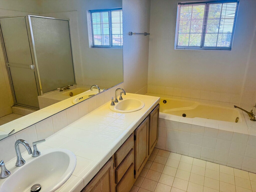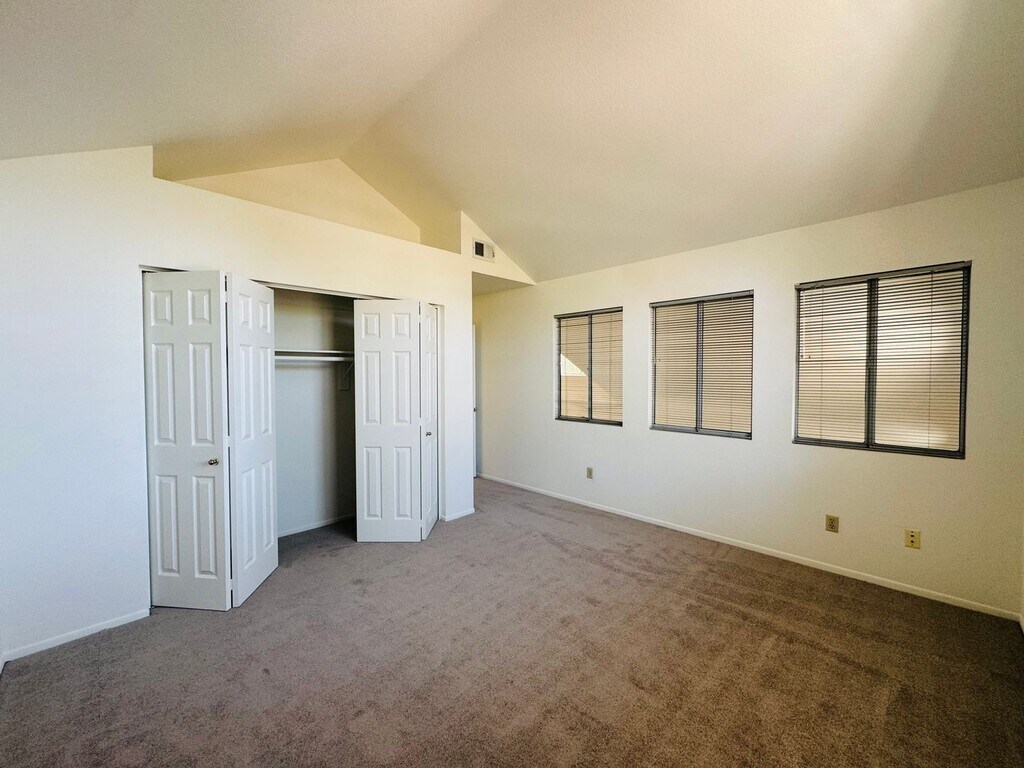 Step into a home that feels more like a private retreat than a rental. This rare Palm Colony end-unit offers the perfect blend of comfort, space, and resort-style living—with all amenities included in the rent. Freshly updated with new paint, plush carpet, and luxury vinyl plank flooring throughout the downstairs, the home welcomes you with soaring vaulted ceilings and natural light that creates an open, airy feel from the moment you walk in. The living room centers around a cozy fireplace—one of two in the home—perfect for relaxing evenings or hosting guests. The thoughtfully designed layout includes a downstairs office conveniently located next to a full guest bathroom with a shower, making it ideal for working from home or accommodating visitors. Upstairs, each bedroom features its own private bathroom, offering comfort and privacy for everyone. The primary suite is a true escape, complete with a walk-in closet, its own fireplace, and a private sunning deck—perfect for morning coffee or unwinding at sunset. The ensuite bathroom includes both a soaking tub (spa jets are not operational) and a separate shower. Additional features include an attached two-car garage and in-unit washer and dryer hookups, with flexibility for either gas or electric dryer. Beyond the home itself, Palm Colony delivers a lifestyle that feels like a year-round vacation. Residents enjoy access to resort-style amenities including a large pool and spa, outdoor grilling areas, fitness center, racquetball court, billiards room, reading lounge, and community kitchen—all included in your rent. If you’ve been looking for a home that offers both everyday comfort and a resort-inspired experience, this is the one.