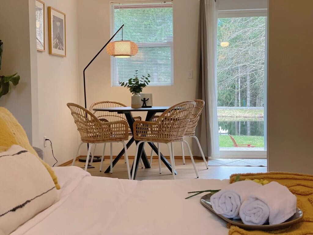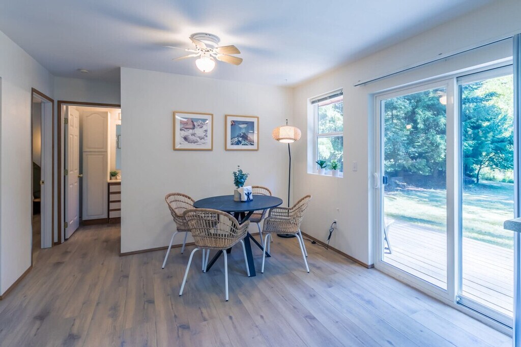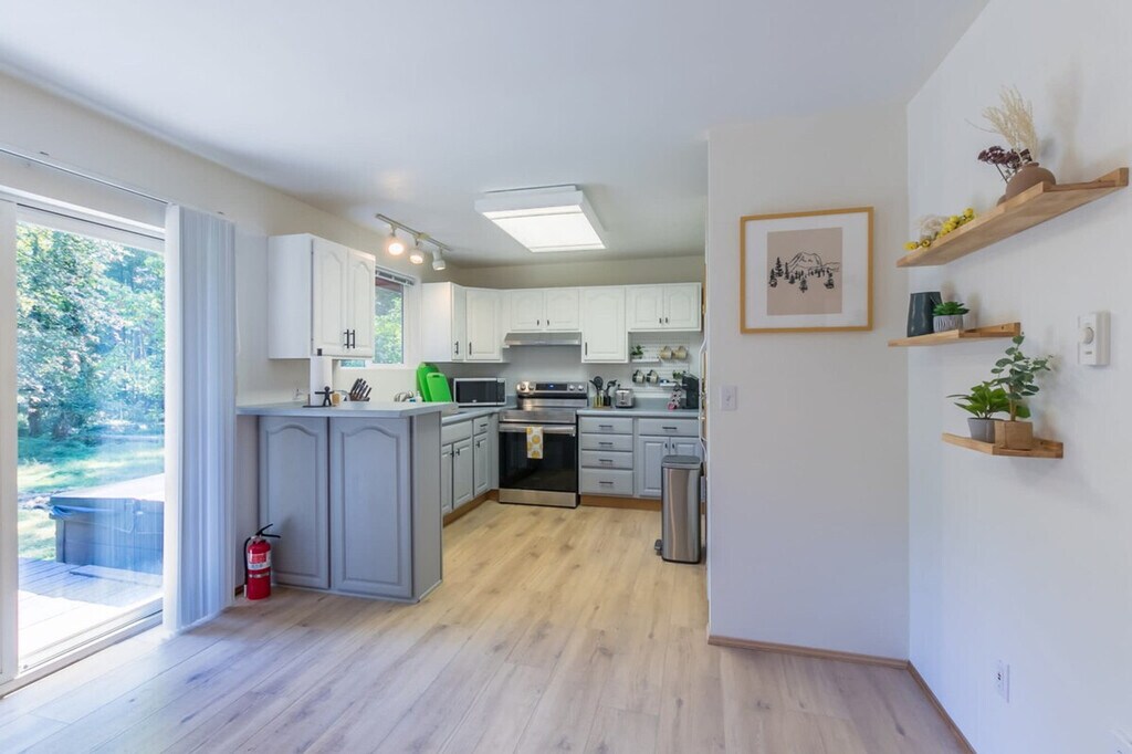 Quiet rambler minutes from Mt. Rainier National Park. This spacious 2-bedroom, 1-bathroom home is set on a large, flat lot with a king-size bed, stone fire pit, and hot tub. Enjoy wildlife and pond views in your ideal getaway! The home is 864 sqft and features a single-level layout with four steps leading to the entrance. Enjoy the serene beauty of the countryside with all the comforts of a modern home in this perfect retreat. Relax on the back deck, soaking in the hot tub while watching deer and elk pass by. A small pond in the backyard connects to Big Creek, offering fishing opportunities for those who bring their own gear. The home features modern updates, a fully stocked kitchen with both a Keurig and a regular coffee maker, and an on-site washer and dryer for your convenience. The regular nightly rate covers 4 guests, with additional guest fees of $25 per person per night, up to a maximum of 6 guests. Well-trained pets are welcome with a fee of $50 per pet per night. Please inform us if you’ll be bringing your pet and how many. Pet fees beyond one pet are processed manually post-reservation confirmation. Located in the private community of Paradise Estates, this home is a mix of full-time residents, vacation homes, and rental properties. Just 5 miles from the Nisqually entrance of Mt. Rainier National Park, the area offers many great hiking trails and outdoor activities. The cabin is accessible by fully maintained roads year-round, though a car is necessary as there is no public transit nearby. Four-wheel drive is recommended in winter, with tire chains available for rent at local stores. This pet-friendly home requests that pets are not allowed on furniture or linens, and they should not be left unattended. Quiet hours are between 10pm and 8am, and there is a strict no-smoking or vaping policy anywhere on the property, including outdoor areas. No parties or events are allowed, and there is a $500 fine per violation. The use of the fire pit and charcoal grill is prohibited during burn bans. [SI]