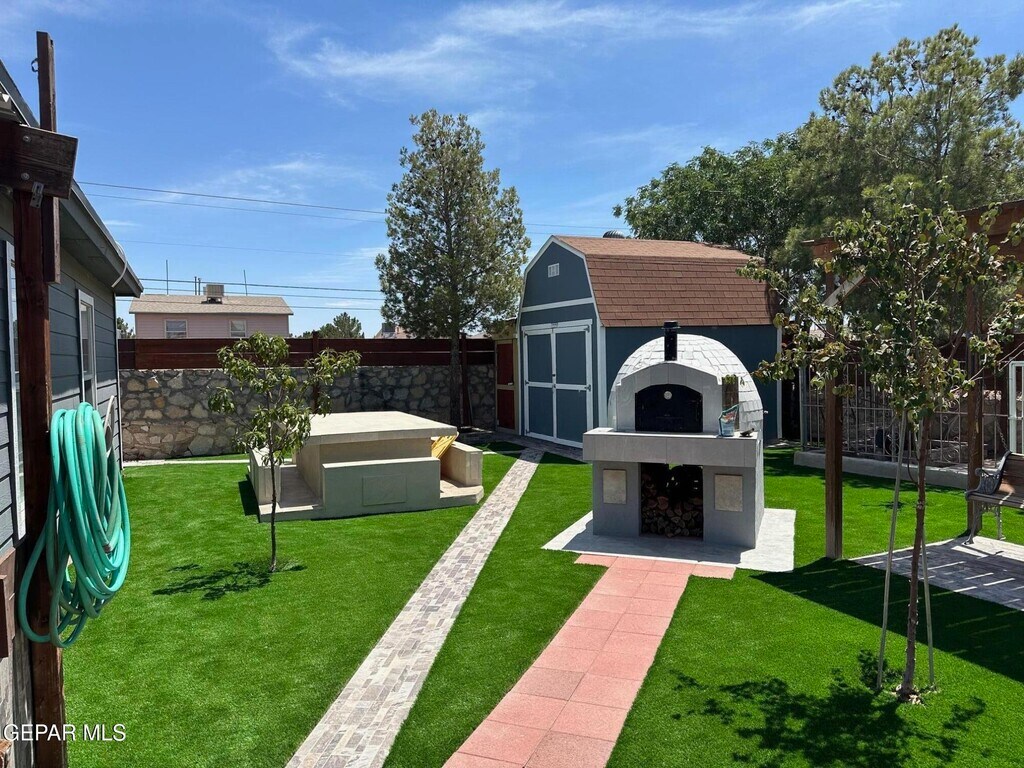 This pet-friendly 3-bed,1.75-bath home perfectly blends comfort and convenience in a prime location. The interior features tile floors throughout for a modern and low-maintenance lifestyle. At the heart of the home is a completely remodeled kitchen,fully equipped with new cabinets and appliances. For added value and a seamless move-in,the refrigerator,washer,and dryer are all included. Step outside to an amazing backyard oasis built for entertaining. Enjoy the shade of the covered patio,the lush look of the artificial turf,and the built-in pizza oven. A dedicated storage shed provides the perfect finishing touch to this exceptional property.