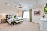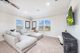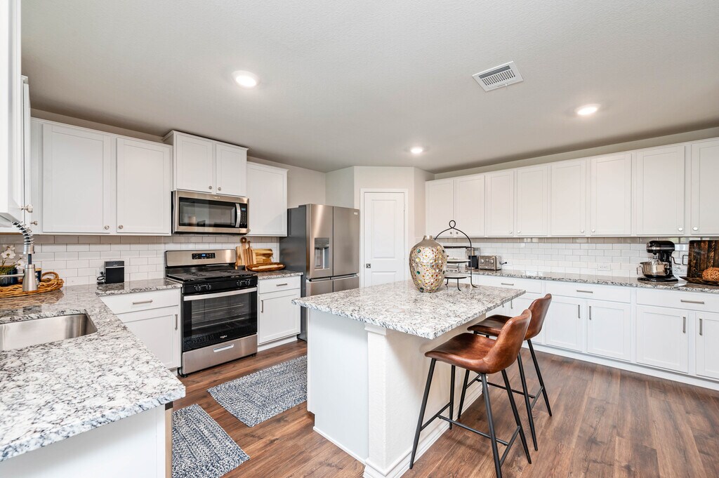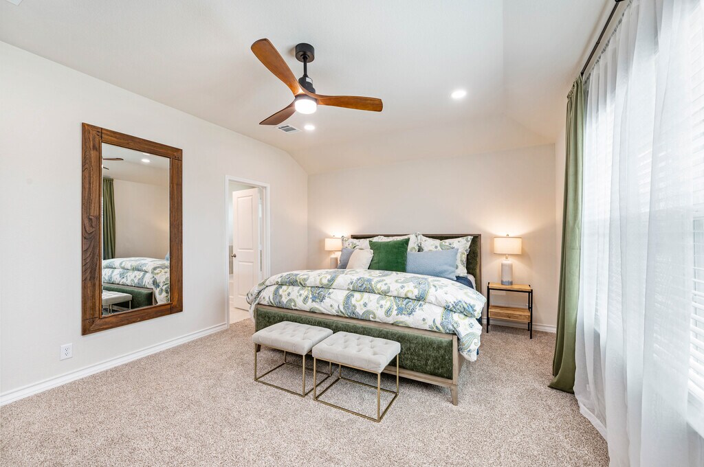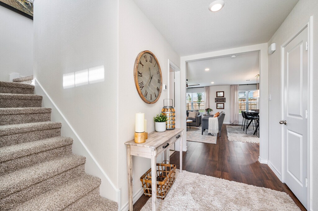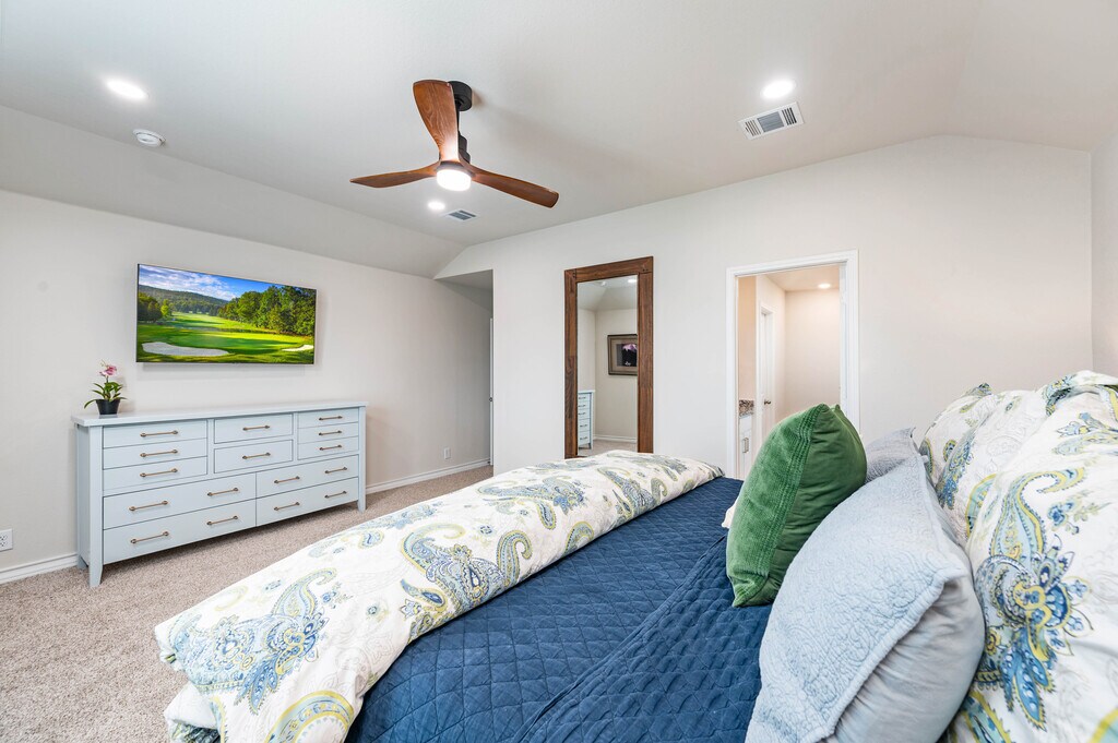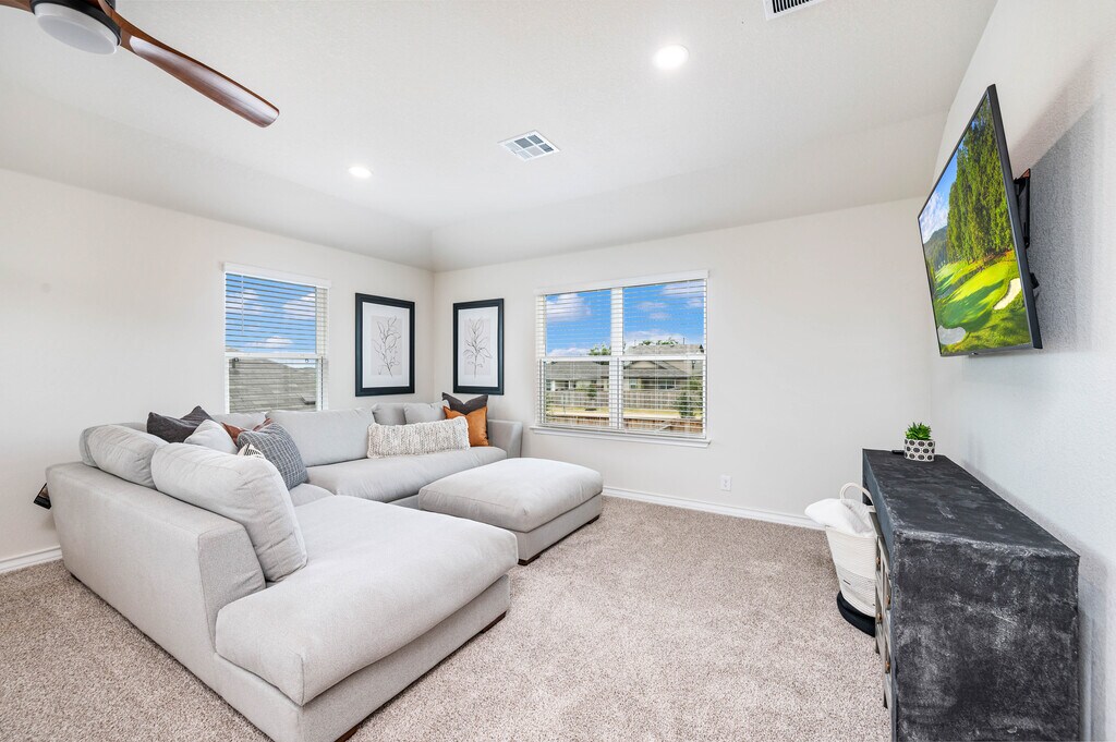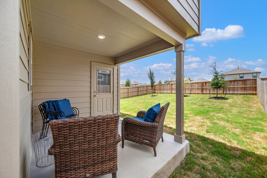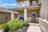 Available as a fully furnished 6-month lease, this two-story home offers a well-designed 3-bedroom, 2.5-bath layout, perfect for those seeking comfort, flexibility, and convenience. A covered front porch opens to a welcoming foyer and powder bath, leading into an open-concept living, dining, and kitchen space ideal for both everyday living and entertaining. The kitchen features granite countertops, a large center island, stainless steel appliances, subway tile backsplash, and a walk-in corner pantry. A window above the sink overlooks the backyard, and the dining area opens to a covered patio. Thoughtful design details include additional can lighting throughout, a decorative hanging fixture in the dining area, and ceiling fans in the family room, loft, and primary suite. Upstairs offers a bright loft, utility room, and all three bedrooms. The privately situated primary suite includes a semi-vaulted ceiling, ensuite bath with dual vanities, separate tub and shower, and a generous walk-in closet. Secondary bedrooms share a full bath and are positioned across the loft for added privacy. Additional features include 9-foot ceilings, luxury vinyl plank flooring in main living areas, ceramic tile in wet spaces, 2-inch faux wood blinds, a water softener loop, full yard irrigation and landscaping, and integrated smart home technology with remote access to lights, locks, and thermostat. A security system with exterior cameras and a video doorbell further enhances peace of mind. Located near Loop 1604 and Highway 281, the home offers quick access to TPC Golf Course and JW Marriott Resort & Spa. Enjoy resort-style community amenities including a pool, splash pad, fitness center, playground, and a calendar of neighborhood events. Shopping, dining, and entertainment are all close by.