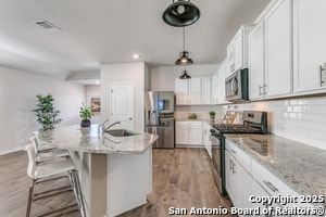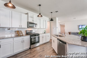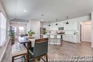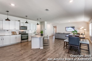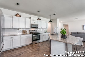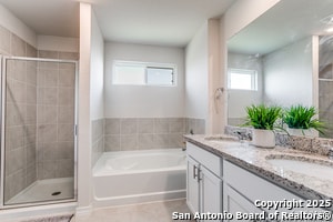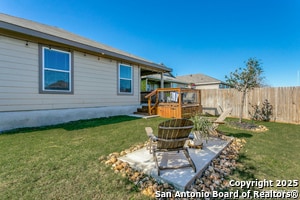 Welcome to this beautifully maintained one-story home in the desirable Langdon Community, offering 4 bedrooms, 2 bathrooms, and 2 2-car garages. The inviting entryway opens to a decorative wall nook and a spacious open-concept family room and eat-in kitchen ideal for both everyday living and entertaining. The kitchen features elegant granite countertops, stainless steel appliances, a classic white subway tile backsplash, and an oversized island with ample workspace and seating. Natural light fills the space, enhancing the warm and welcoming atmosphere. Two secondary bedrooms and a full bathroom are conveniently located off the front entry, while a third bedroom and the utility room sit just off the kitchen. The private main bedroom is located at the rear of the home and includes a relaxing ensuite bath with dual vanities, a separate tub and shower, and a generous walk-in closet. Additional features include ceramic tile flooring throughout the home, a covered patio with an extended wood deck perfect for gatherings, grilling, or peaceful evenings outdoors, and yard landscaping with an irrigation System. Residents of Langdon enjoy access to one of the area's premier amenity centers, complete with a clubhouse, gym, pool, dog park, trails, and sports courts. This home is conveniently located just minutes from The Villages at Stone Oak shopping center, great dining options, and offers easy access to Hwy 281 and Bulverde Road. You truly must see this home to appreciate everything it offers, both inside and out. Don't miss your opportunity to make it yours!