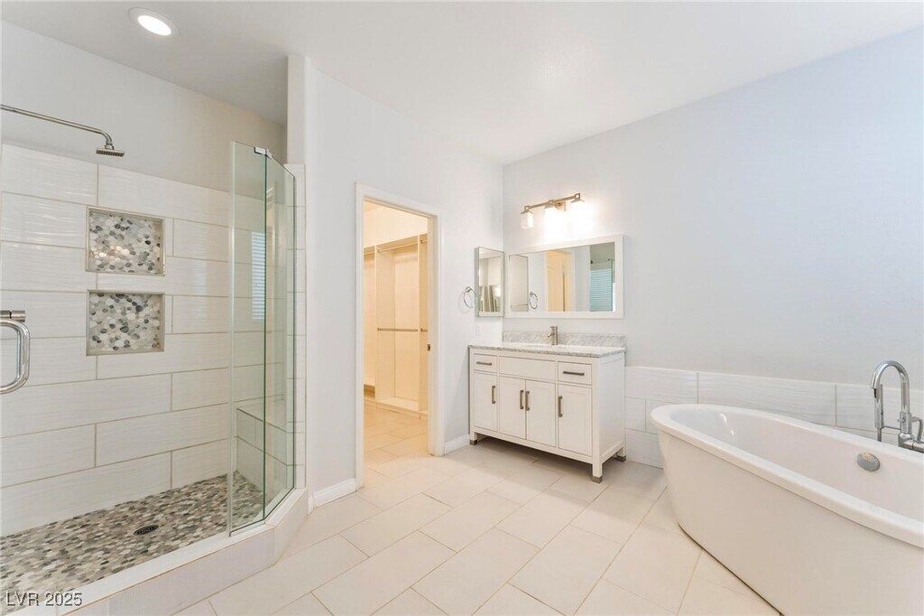 Welcome to the highly coveted Green Valley Ranch! This single-story gem, boasting over 2850 SF, is situated in an ideal location with easy access to The District's shopping, dining, movies, and gaming. Green Valley Ranch offers acres of great schools, parks, paths, and playgrounds, making it a perfect choice for those seeking a vibrant and active lifestyle. Recently renovated, with four bedrooms, three bathrooms, and a three-car garage, this home offers both comfort and convenience. The large primary bedroom boasts a sizable walk-in closet with custom built-ins. The wide open kitchen features stainless steel appliances and glass backsplash. Additional features include ceiling fans, window coverings, and garage storage cabinets. $100/m for water, sewer, and trash for total periodic rent of $3500/m.