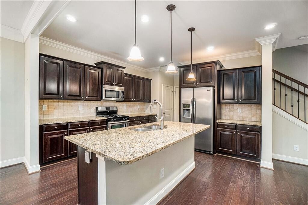 Beautiful 3-sided end-unit townhome located in the highly sought-after West Village community! This home offers a spacious,open floor plan featuring a gourmet kitchen with a large granite island,stainless steel appliances,and ample cabinetry,perfect for both everyday living and entertaining. The inviting living room showcases custom trim,a cozy fireplace,and built-in shelving,all seamlessly connected to a generous dining area. Hardwood floors run throughout the main level,which also includes a convenient half bath,a private patio,and direct access to the two-car garage. Upstairs,the oversized primary suite features a tray ceiling,a large walk-in closet,and a spa-like bath complete with a separate shower,double vanities,and a linen closet. Two additional bedrooms,a full bath,and a laundry room with washer and dryer included complete the upper level. Rent includes exterior maintenance,grounds maintenance,sewer,water,trash,and access to swim/tennis amenities. West Village offers an exceptional lifestyle with a community pool,fitness center,boutiques,shops,and popular dining options just steps away. Conveniently located minutes from The Battery,Truist Park,the Silver Comet Trail,and nearby parks,with easy access to I-285. Just 15 minutes to downtown Atlanta and the airport. Tour by appointment only. Non-Smoking Home. Call regarding pets. MLS ID 7754532