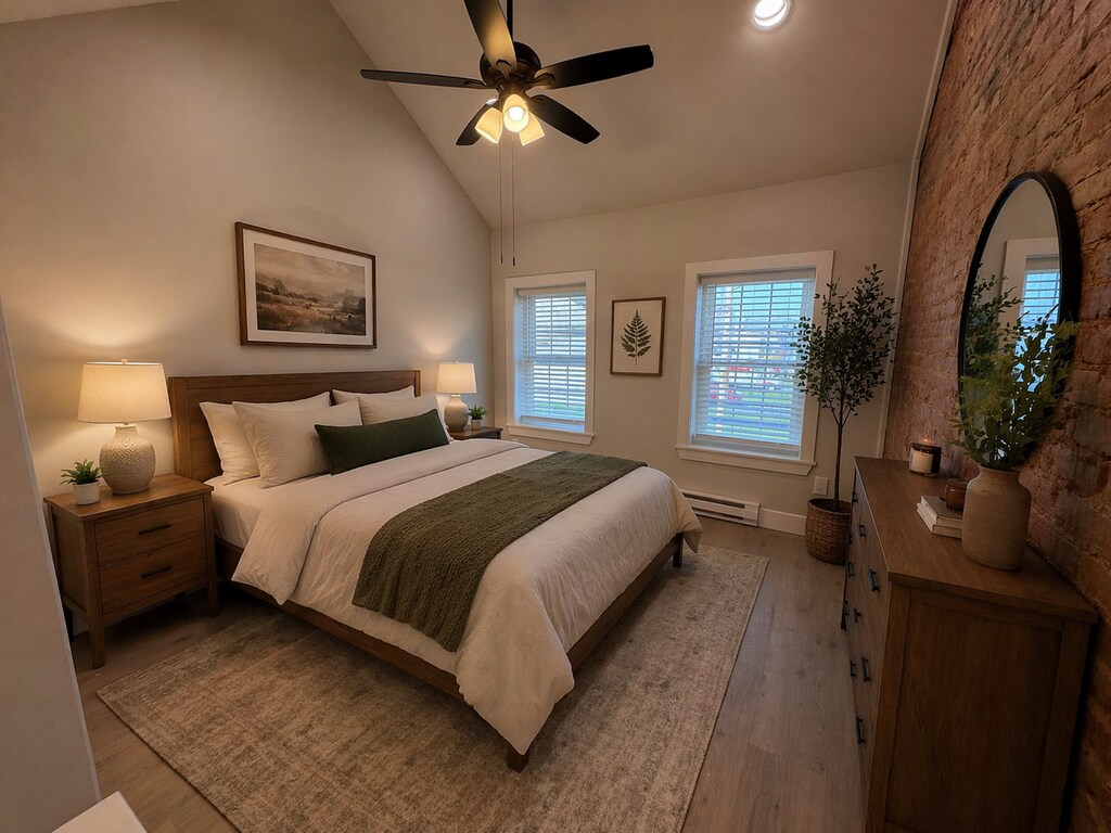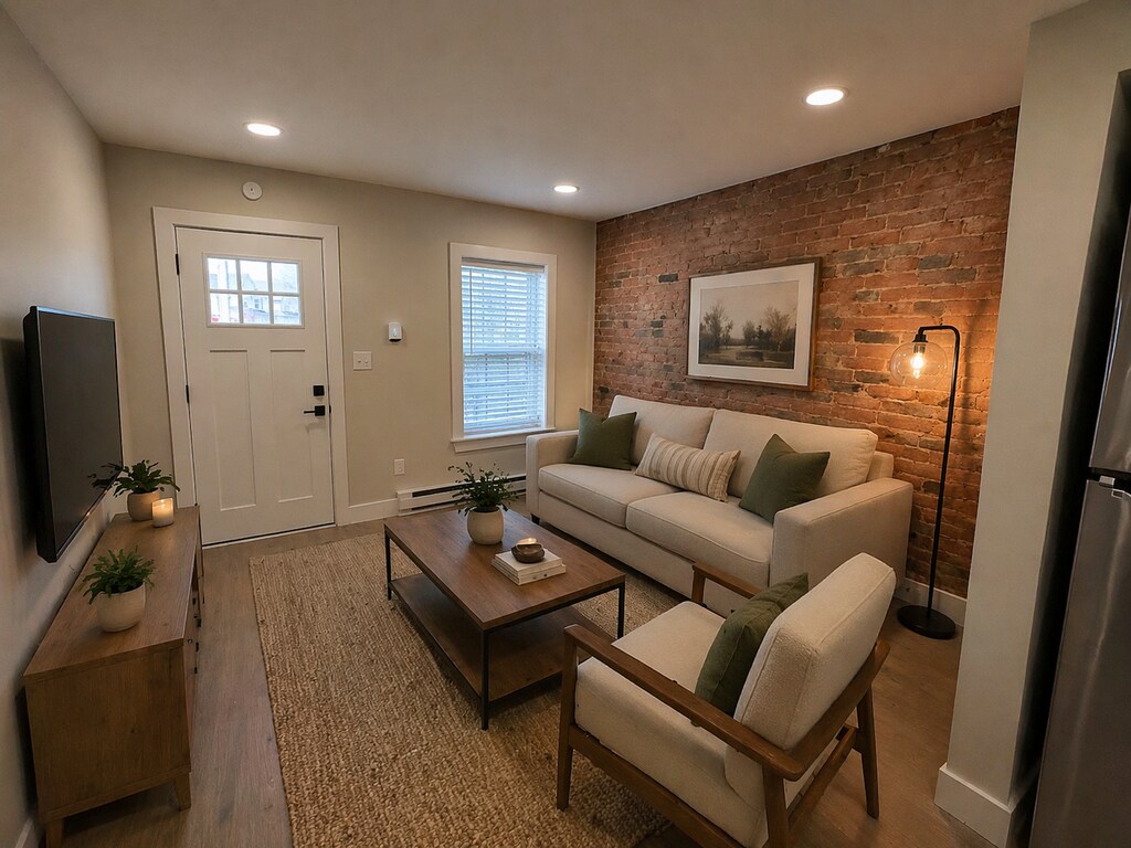 Discover the perfect blend of industrial charm and modern sophistication in this beautiful one-bedroom home. This residence offers a peaceful retreat while being just steps away from the local park and the quiet countryside. The first floor welcomes you with an open-concept living room and kitchen designed for both comfort and style. A stunning exposed brick wall serves as the home's primary focal point, adding warmth and historic character to the space. Prepare meals in a modern kitchen featuring sleek quartz countertops, stainless steel appliances, and contemporary LED lighting. High-quality Pergo flooring offers the timeless look of hardwood with the added benefit of modern durability and easy maintenance. Ascend the stairs to the second level, where you’ll find a spacious bedroom suite designed for relaxation. Vaulted Ceilings: The bedroom features soaring ceilings that create an airy, expansive atmosphere. Laundry Included: No more trips to the laundromat—a full-sized washer and dryer are conveniently located right in the home. Step outside to find a serene backyard, offering a quiet escape for morning coffee or evening unwinding, this home offers a unique living experience in a quiet, sought-after neighborhood.