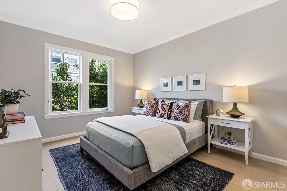 Beautifully remodeled 3-bedroom, 2-bathroom condo w/~1800 sq.ft. of living space. Spacious living room w/fireplace is adjacent to the formal dining room w/direct access to a tiled patio for alfresco dining. Gorgeous gourmet kitchen features a Viking cooktop, Thermador oven w/warming drawer, SubZero refrigerator, Miele dishwasher, wine fridge, built-in microwave, plus abundant stone countertops, custom cabinetry and an eat-in breakfast nook. Laundry room w/LG WD is conveniently off the kitchen. Down the hall are 3 bedrooms at the rear of the property, including a primary bedroom suite w/built-in shelves and cabinetry, walk-in closet and ensuite bath w/double vanity and shower over tub. 2nd good-sized bedroom and small 3rd bedroom/office/nursery share an updated bathroom w/stall shower. 2-car garage parking included (vehicle-size-dependent). Stylish wide plank white oak hardwood floors, contemporary lighting, and crown moldings give this home a chic, modern feel. Just 2 blocks to the vibrant shops and restaurants on Chestnut St. Moscone Park and Playground are close by, with Safeway and Fort Mason only moments away. This location offers effortless access to daily conveniences and neighborhood charm. Commuters will appreciate the easy freeway access, making this an ideal home base for both city living and getting around the Bay Area. MLS # 426101112