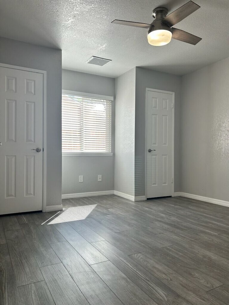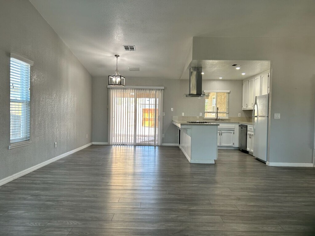 1437 sq. ft. Three bedroom, two bath house, newly renovated. Open kitchen with quartz counter tops and new stainless steel appliances. Faux wood flooring throughout the house and tile flooring in bathrooms. Living room has a brick fireplace. Bathrooms have new quartz counter tops, new vanity mirrors, and new toilets. Stand alone shower in master bathroom en suite. Indoor Laundry room. New sliding doors leading to covered patio with large backyard. Xeriscape front yard. Evaporative cooling and forced air heating. White refrigerator provided but not warrantied.