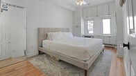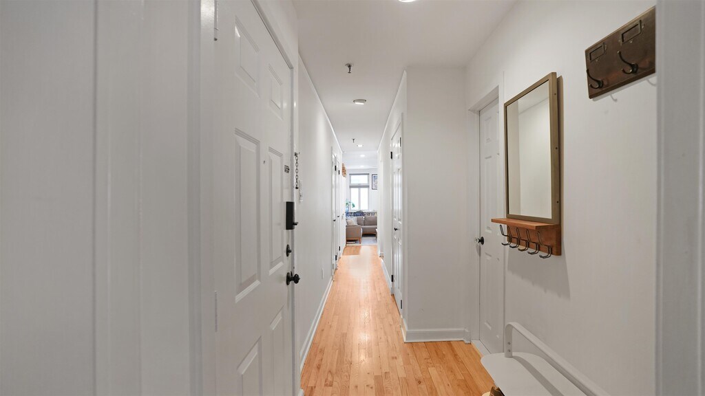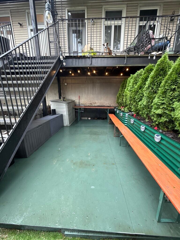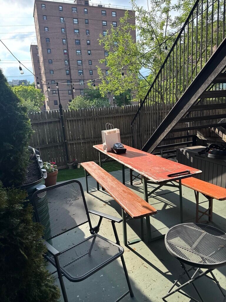 Sun-filled, full-floor one-bedroom with private backyard, terrace, and garage parking in Hoboken. This renovated condo offers soaring ceilings, hardwood floors, and a front-to-back layout with east and west exposures. The living room opens directly to a large private terrace and exclusive backyard featuring turf, decking, string lights, and lush landscaping with no buildings behind — a true outdoor oasis. Kitchen and bath were fully renovated in 2022 with quartz countertops, subway tile, stainless appliances, and modern finishes. The bedroom easily fits a king-size bed and includes custom built-in storage, plus multiple additional closets throughout the home. Garage parking included. App-based laundry on site. A rare combination of light, space, and outdoor living.