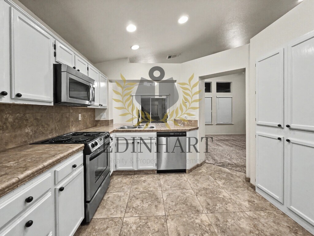 A home that offers space, comfort, and an inviting sense of openness from the moment you step inside. 2282 E Decatur features expansive single story living with soaring ceilings, abundant natural light, and a thoughtfully designed layout that feels both spacious and welcoming throughout. The main living area showcases dramatic vaulted ceilings and a striking fireplace that anchors the space and creates a warm, inviting atmosphere. The open flow provides a bright and airy environment while maintaining comfortable separation between living areas. The kitchen offers clean finishes, stainless appliances, and a practical layout that connects naturally to the main living space, creating easy everyday functionality. The home's neutral interior, generous room sizes, and well balanced design provide a comfortable and move in ready setting. The primary suite offers a spacious retreat with dual closets, a private bathroom, and dual sink vanity. Three additional bedrooms are well sized and thoughtfully positioned throughout the home. Indoor laundry and ample storage add everyday convenience, while the overall layout emphasizes comfort and ease of living. The home also features a private backyard with covered patio space, offering a comfortable outdoor area for relaxing and everyday use. Landscaping service is provided by the owner.