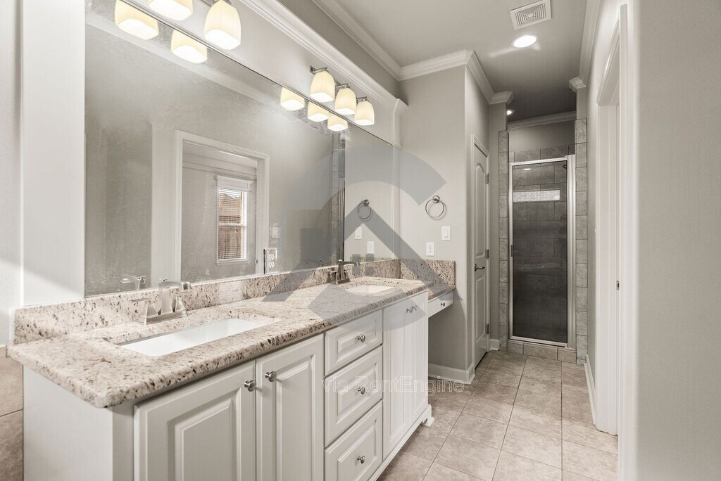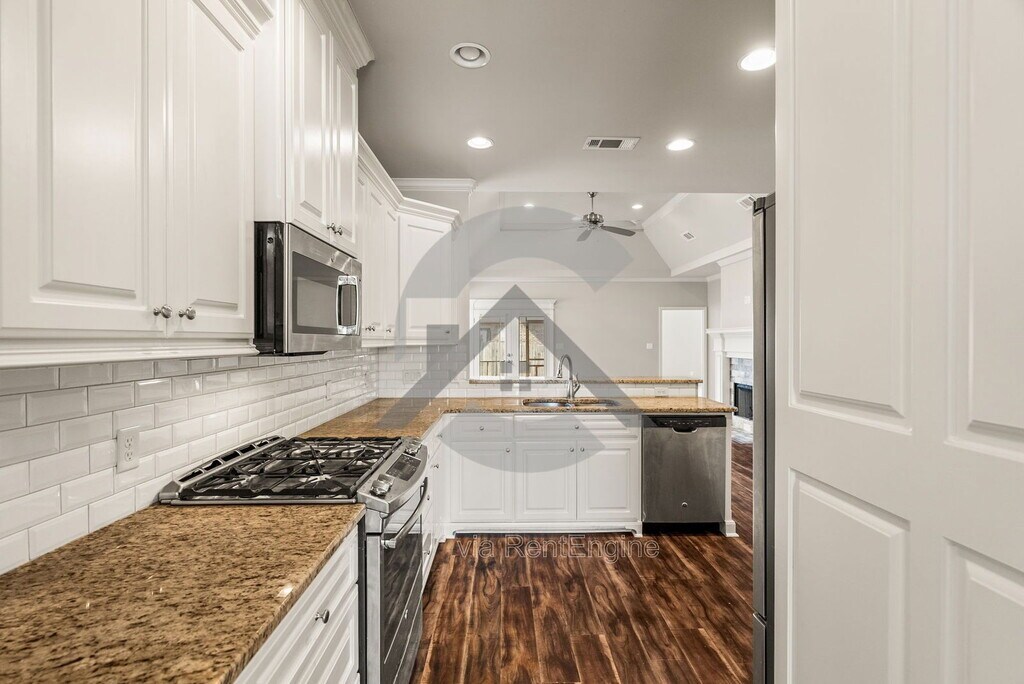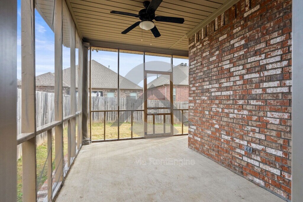 This stunning home offers an open, modern layout with luxury vinyl flooring, tall tray ceilings, and a cozy stone fireplace in the spacious living area. The bright kitchen features granite countertops, white cabinets, stainless steel appliances, gas range, and a large island—perfect for cooking, entertaining, or everyday living. The primary bedroom is oversized with plush carpet, a huge walk-in closet with built-ins, and a spa-style bathroom with double vanities, soaking tub, and walk-in tile shower. Secondary bedrooms are spacious and bright with ceiling fans and great closet space. Enjoy relaxing evenings on the covered, screened-in patio with ceiling fan, overlooking the fenced backyard. This great layout, move in ready home is awaiting for someone to make it home. Schedule your tour today! No pets accepted. Washer and dryer can convey with additional monthly rent. By submitting your information on this page you consent to being contacted by the Property Manager and RentEngine via SMS, phone, or email.