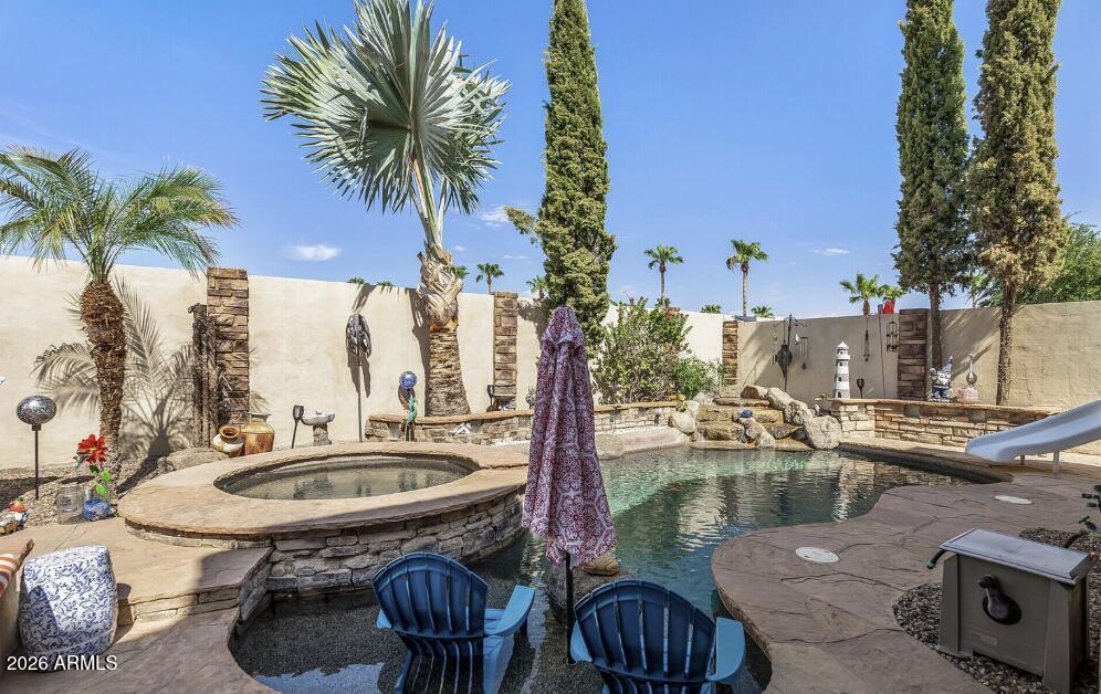 Stunning move-in ready home in an unbeatable location near top-rated schools,shopping,dining,freeway access,and just minutes from Goodyear Ballpark. Be welcomed by a grand foyer and dramatic staircase,with a functional floorplan offering main-floor living and a luxurious primary suite featuring a walk-in closet and beautifully remodeled spa-style bathroom. Enjoy an elegant dining area,oversized living/den space,and a chef-inspired kitchen with premium appliances and a gorgeous granite island that opens to a cozy family room -- perfect for entertaining. Upstairs offers four spacious bedrooms,two full baths,and a massive bonus room ideal for a media room,gym,or playroom,it is currently used as a 6th bedroom. Step outside to your private resort-style backyard with a heated saltwater pool,waterslide,waterfall,spa,and built-in BBQ with fridge -- an entertainer's dream. A rare rental opportunity that truly has it all.