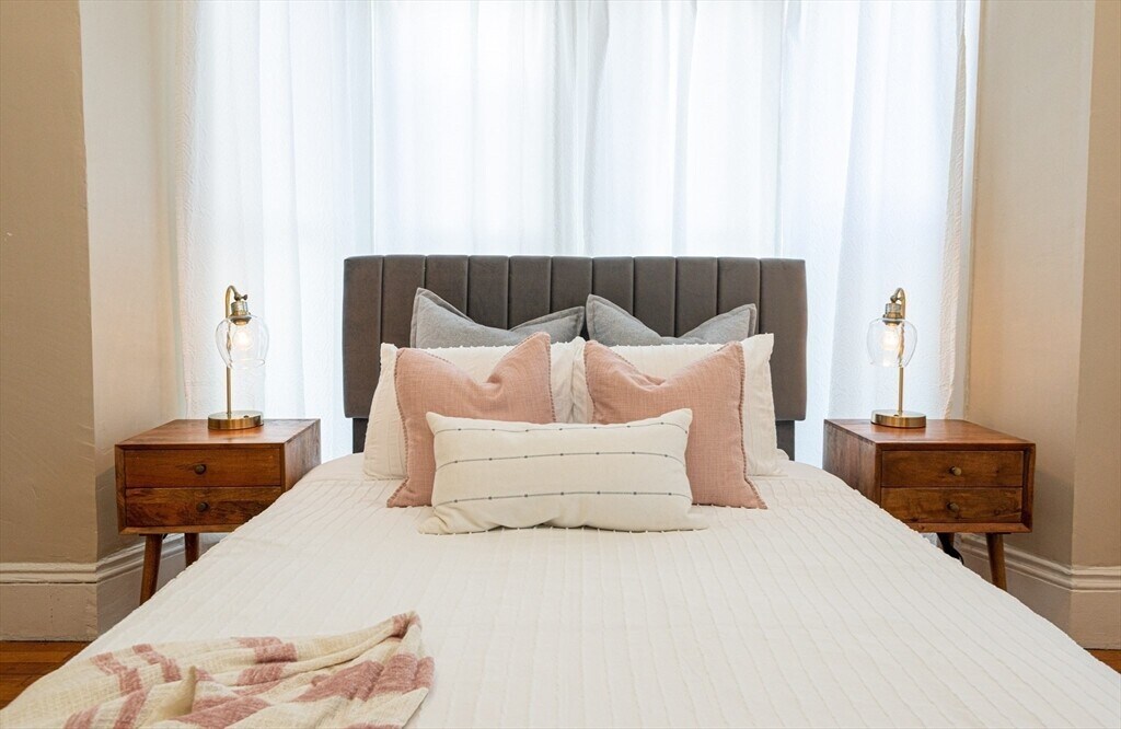 **Furnished rental with all utilities included,rental term negotiable** Located 2 blocks to the Atlantic Ocean and 12 miles North of Boston in Lynn's treasured Diamond District. This 1st floor unit was tastefully renovated in 2020 with all new electrical wiring,LED lighting,9 foot kitchen island with quartz counters,stainless appliances,hotel style vanity/bathroom layout with custom tiled shower. Original Classic details like 10 foot ceilings,columns,hardwood floors,and decorative mantels remain. First bedroom is fitted with a queen bed,2 closets,dresser,desk,and chairs. Bedroom 2 is fitted with a full bed and wardrobe,across from a separate home office space. Utilities included in rent: water/sewer,heat,hot water,wifi. Common laundry in the basement. Private fenced in yard. One off street parking space. Pets negotiable. Rental term negotiable,minimum term 2 months. MLS# 73463381