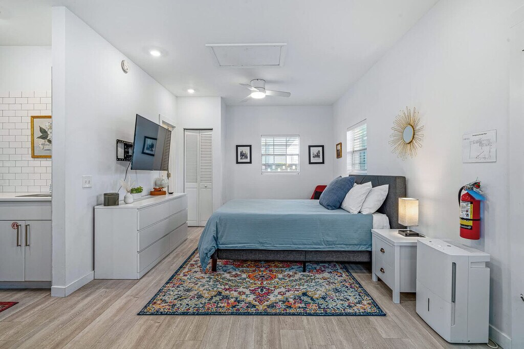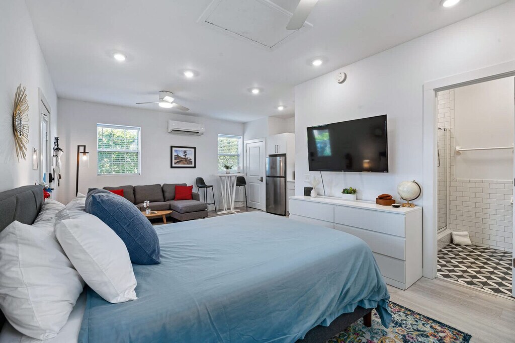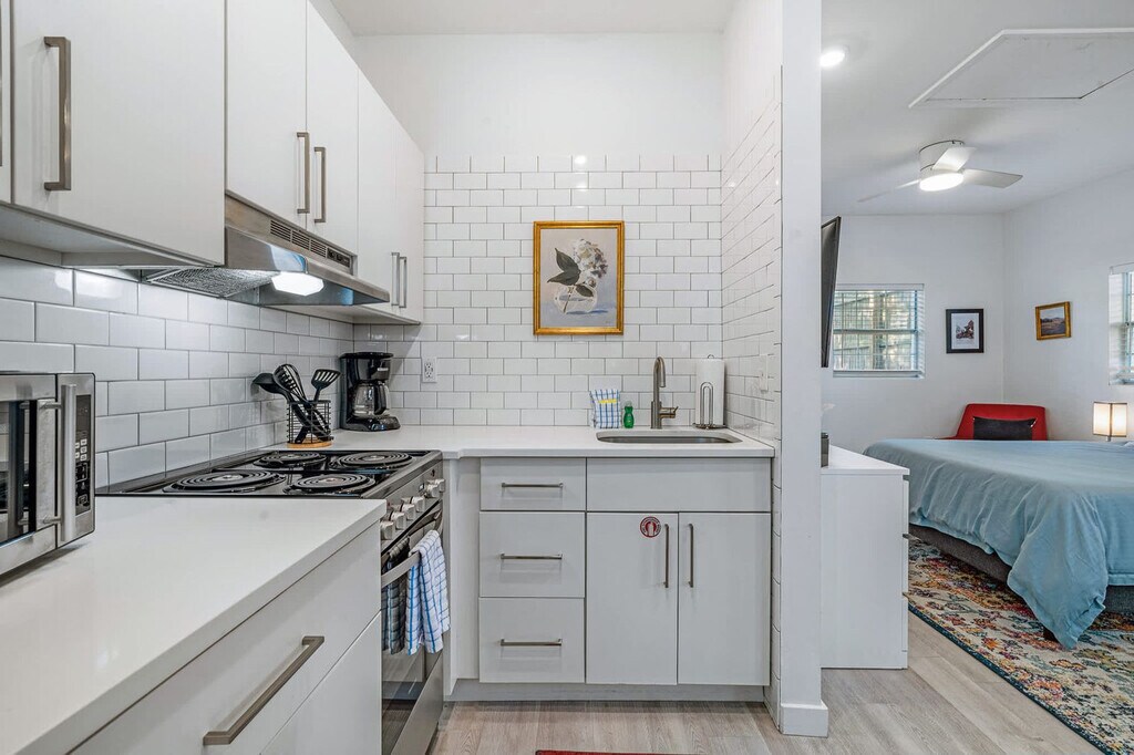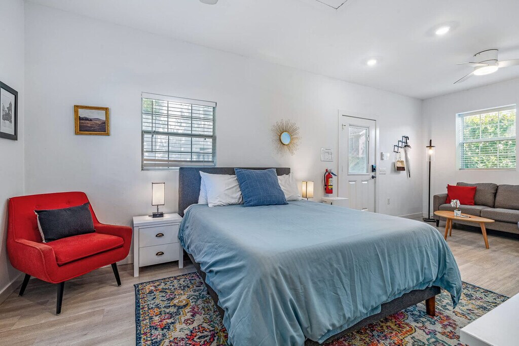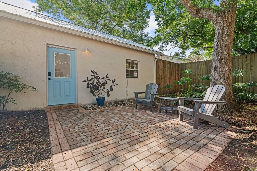 Tucked beneath the trees, feel at home in this charming, private studio cottage, perfect for couples and solo travelers. This charming studio cottage features a fully equipped kitchen with a drip coffee maker, pots and pans, plates, bowls, silverware, and glassware. It also includes a bar-height dining table for two, a comfortable queen bed, a dresser and closet for clothes storage, a pack n play, and a full bathroom with a walk-in shower. Relax in the outdoor sitting area with Adirondack chairs. One off-street parking space is available. This is a pet-friendly property for one dog under 50 lbs, and a $100 nonrefundable pet fee will be applied. Located less than a 15-minute walk to downtown and a 10-minute drive to Vilano Beach, this cottage is just a few minutes' walk to many local favorites including Sunday Gathering Table, Raintree, and Juniper. The trolley stop is down the street at the Mission Nombre de Dios. Experience flavorful dining, art, and culture with an abundance of entertainment right on your doorstep. The suite is located right in the heart of Uptown St. Augustine, just a few minutes’ walk from the main street known for boutique shops, art galleries, and antique stores, as well as local eateries. The downtown Historic District is a 15-minute walk away. Those who appreciate architecture from the 1800s to the 1920s will want to walk through a number of small neighborhoods listed on the National Register of Historic Places. Jump aboard the Trolley to see the city, or hire a bike and take your time soaking up each neighborhood, museum, and monument. Courtyard Cottage is in short walking distance to all things downtown so you can park your car and leave the keys at home! Guests can also use rideshare apps like Uber and Lyft or call a taxi with cars available at all times of the day. Once in the city center, many of St. Augustine's shops, restaurants, art galleries and attractions sit within the historic city center, making it easy to get around on foot. Quiet hours are between 10:00 PM and 8:00 AM. The minimum age to book is 21. The primary guest on the reservation must be present for the duration of the stay. If you have more guests on the premises than you have notated in your reservation, an additional fee may be charged. No parties are allowed. No vaping or smoking is allowed whatsoever inside or outside the property, including the outdoor patio. Illegal drugs are strictly prohibited. Do not flush anything down the toilet except toilet paper. Renters are 100% liable for any and all property damage, caused by themselves or guests, during their stay. If a late check-out or early check-in can be accommodated, $15 per hour will automatically be added to your reservation. Additional charges will apply if dog feces is not picked up and properly disposed of ($50 per pile). [SI]