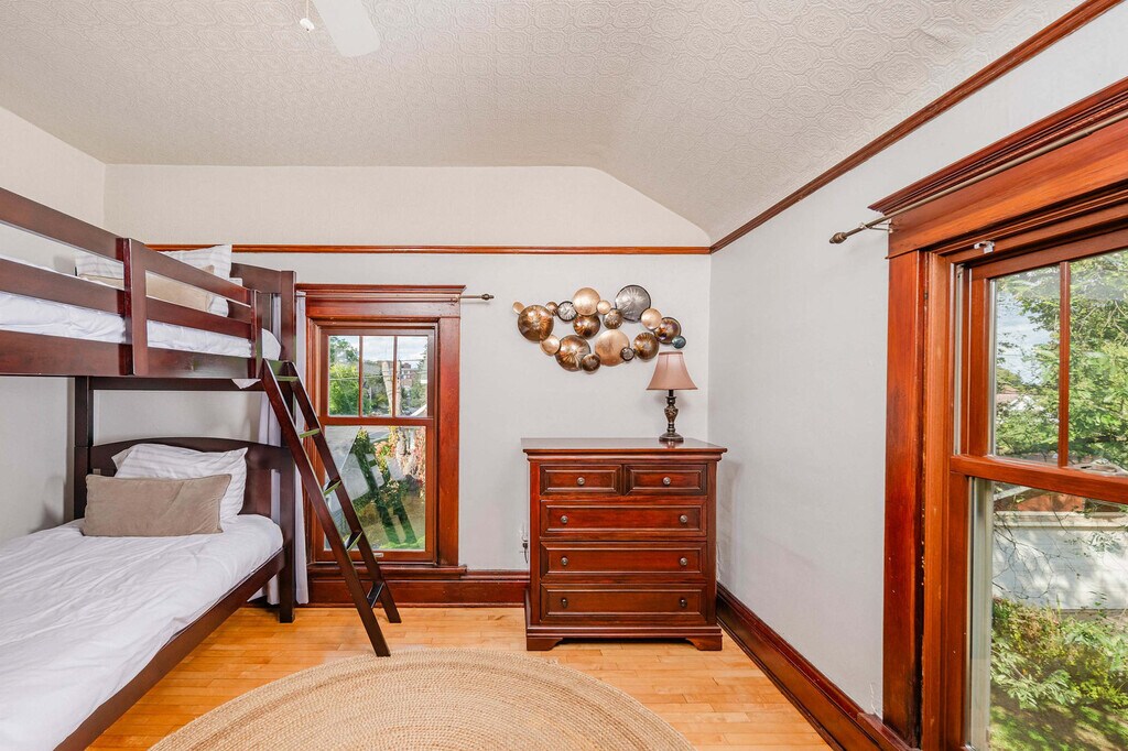 Located in the heart of downtown Stevens Point, this charming apartment is filled with old-world charm and modern amenities. Steps from the university and the hospital, the home is close to parks, playgrounds, and restaurants. With high ceilings, light-filled rooms, and a welcoming ambiance, you'll feel at home with its accessibility to everything. Relax and enjoy your evenings on the veranda, making it a great place for couples, business travelers, families with kids, and big groups. You will love this home for its abundance of natural light, working fireplace, and beautiful hardwood floors throughout. It offers tons of sleeping space and free parking with a one-car garage available along with one vehicle in the driveway. While dogs are allowed with a pet fee, cats or any other pets are not accepted. Dogs must be kept off all furniture and beds, fully housebroken, and fully cleaned up after outside. Situated in a quiet, safe residential neighborhood, the area is great for walking around. Uber and Lyft are easy to use and abundant in the area. If you have a car, the city is easy to navigate, and there is free parking in the garage and driveway. There is absolutely no smoking of any kind in the home, and violation of this rule will result in a $250 fine. Absolutely no parties are allowed. Please take off shoes when entering and make yourself at home. [SI]