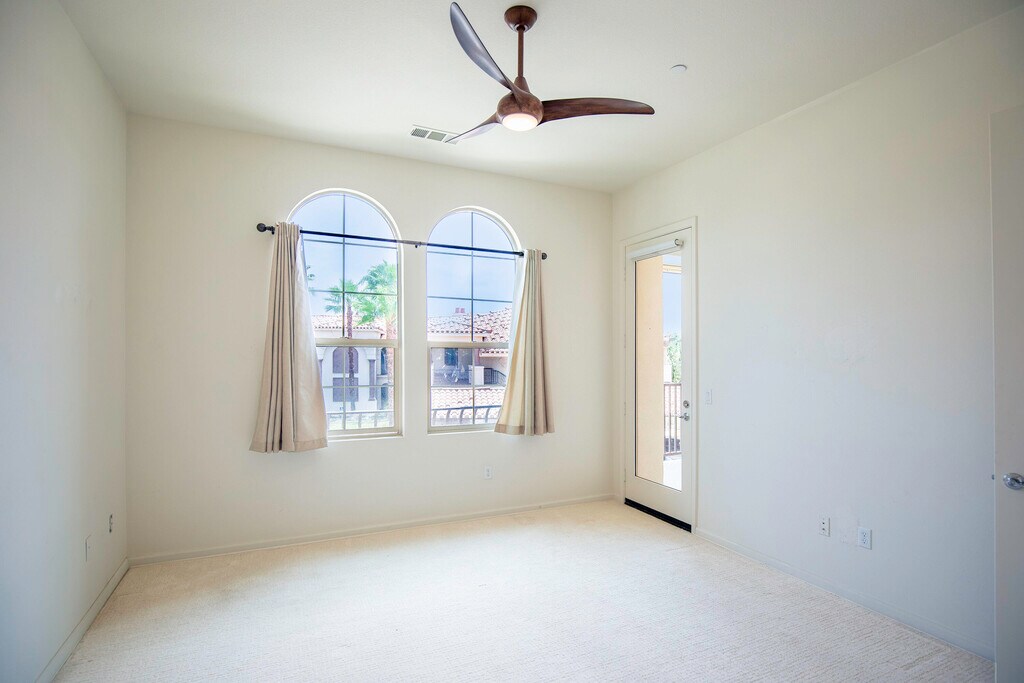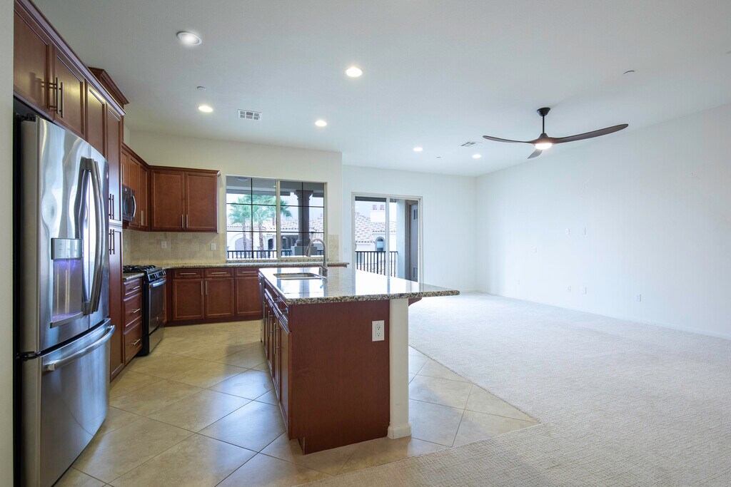 A LIFESTYLE in VILLA PORTOFINO a Senior living Plus 55 Community. This quiet second floor CONDO is south facing with a large Patio/Balcony for morning Coffee and evening Cocktails while enjoying a peek-a-boo view of the southern Mountain Range. Enjoy natural light throughout the Great Room that includes a Kitchen with Island/Breakfast Bar,Custom Cabinets,Granite Counter tops,Stainless Appliances,Den/Media Room,Living area,Dining Area and finally a Single Primary Bedroom with private Bathroom Ensuite and large Walk-in Closet. Separate hallway Guest/Powder Bathroom and Laundry room. Amenities include large Single/Tandem Garage,Elevator for easy access to Condo. Enjoy Villa Portofino's over 30,000 square foot Clubhouse that includes a Bistro,Movie Theater,fine Dining Room,Outdoor Patio Dining,Billiard room,Library,Conference room,Yoga and outdoor large Lap Pool,Spa,Cabanas,Bocce Ball with amazing views from the adjoining park overlooking San Jacinto and Santa Rosa Mountain Ranges. Minutes to the public Desert Willow Golf Course,El PASEO shops,restaurants,art galleries,hotels and leisure district plus neighborhood Grocery stores and Delis within walking distance. A must see on your tour of fine long-term rental homes!