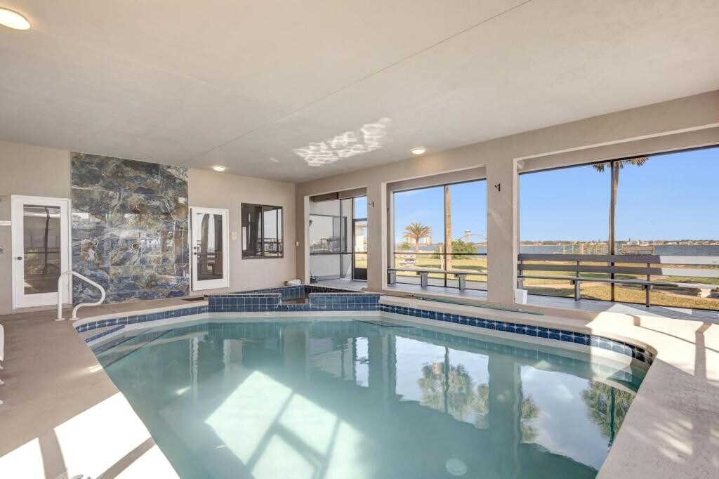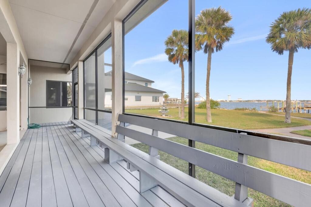 Truly one-of-a-kind, two story, gated Halifax Riverfront Estate, with many exceptional features, that can be appreciated in person viewing. Locked and gated entry is regulated by a solar powered gate, Paved long drive is lined with lush trees, Vegetation and stone fountain leading to a fully covered brick portico, perfect for rainy or extra hot weather. Artistically carved naturally finished real hardwood double doors lead to the large foyer, welcoming you to a game of pool or darts, before launching into the amazing views this house offers. This spacious house can comfortably accommodate large groups including 4 junior suites with balconies and amazing water views in each. Plenty of room for live entertainment and large events. Big picture windows throughout allow plenty of light and offer inspiring sights. Covered non-heated pool with dry sauna Jacuzzi. Please keep in mind that the pool and the sauna are NOT HEATED at this time. 300 degrees of water views, dock, with nice views of shuttle launches, and breathtaking views of the rising sun from all bedroom balconies, remodeled kitchen, real Oakwood floor, large yard, security lights, open 360 degrees observation dock. Four car garage with covered portico. Fully furnished to accommodate parties of 12. Links: