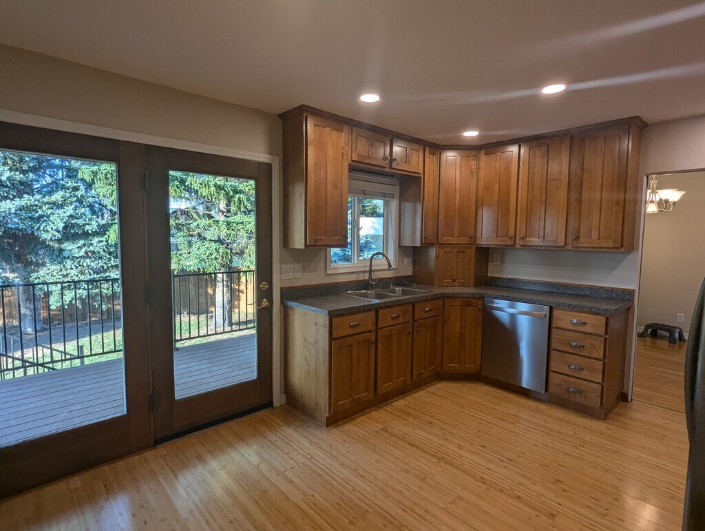 Welcome to this exceptional corner lot property in a prime location, directly across from a park and near walking trails. This property boasts a spacious yard, a well-maintained exterior with a sprinkler system, and a new 20x40 Trex deck perfect for outdoor gatherings. Surrounding the property are mature pine trees and a cedar fence, providing both privacy and a serene environment. Inside, the home offers over 2400 square feet of living space, featuring 4 bedrooms and 3 full bathrooms. The layout includes a spacious living room both upstairs and downstairs, offering flexibility and comfort for everyday living and entertaining. The master suite is highlighted by its walk-in tile shower and expansive walk-in closet, providing ample storage space for all your needs. Recent updates include fresh paint throughout. The kitchen has been modernized with updated cabinets and a new dishwasher, microwave, and stove. Lighting and fans have been updated throughout the house as well. Two new mini-splits are in the upstairs and down stairs living rooms that provide AC in the warm summer months or additional heating if needed in the winter. The combination of wood flooring, tile, and carpet provides both comfort and aesthetic variety. For vehicles and additional storage needs, the property includes a full true 2-car garage with an additional storage room, ensuring plenty of space for all your belongings. Outside, there's ample parking available, accommodating not just multiple vehicles but also providing room for a boat, RV, or large truck. Additionally, a convenient storage shed is available for storing outdoor equipment and tools. *Tenant Responsible for: Electricity, gas, trash, water, lawn care/maintenance, snow removal *Landlord Responsible for: Sewer *No smoking and/or vaping allowed. *Pets upon approval. $50/mo + additional $500 deposit per pet *12 month lease preferred, with option to renew.